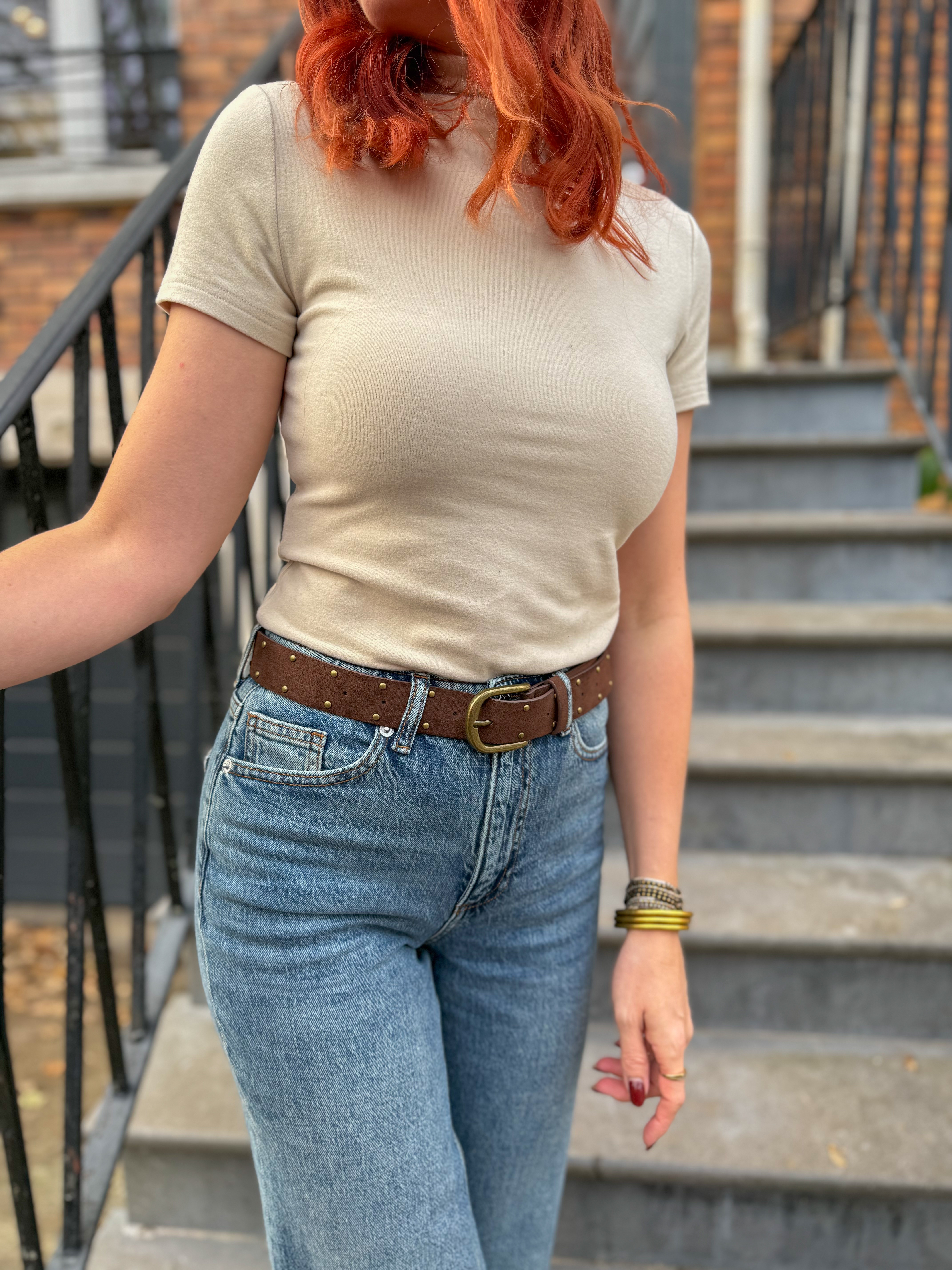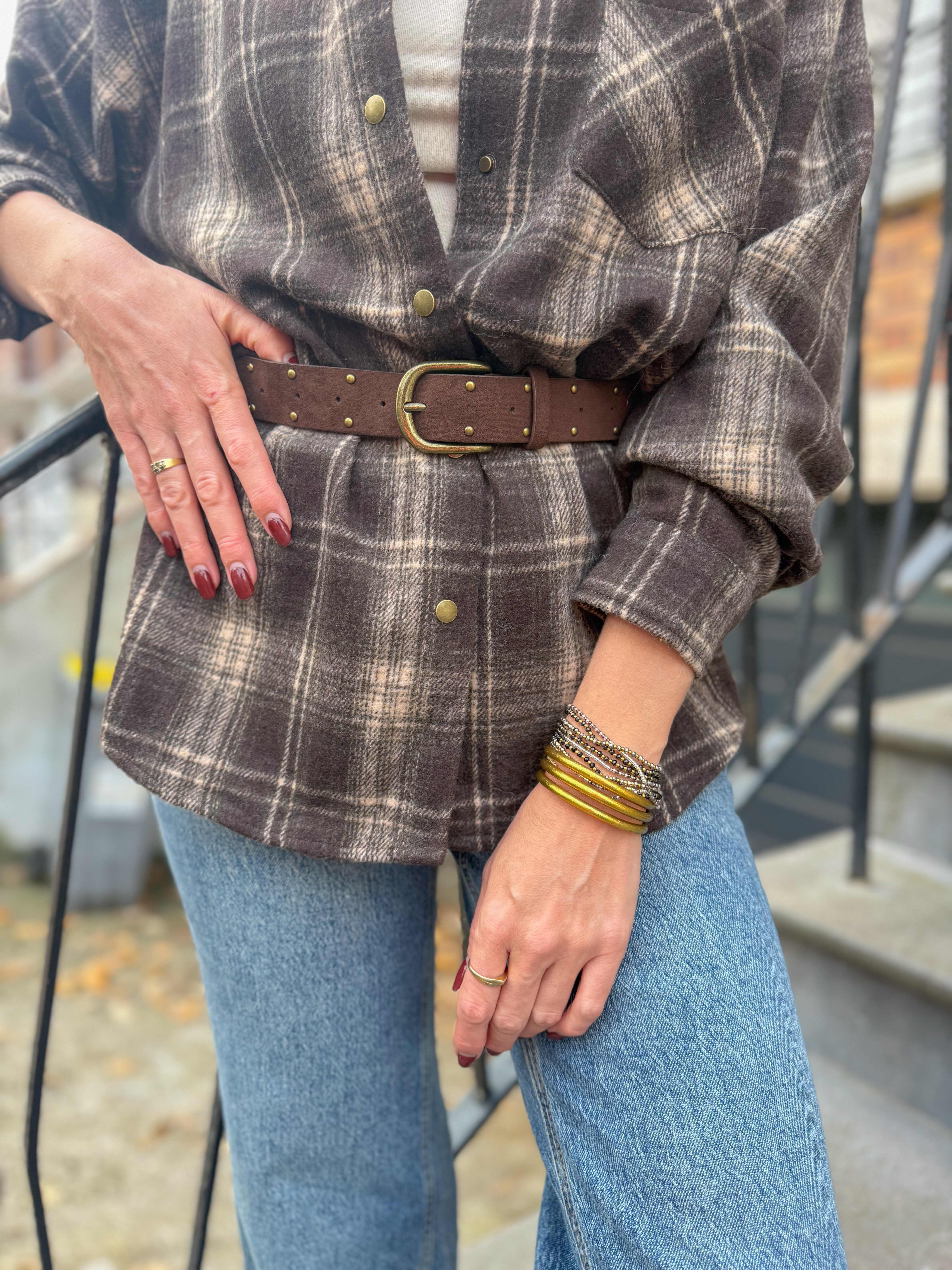 Notre ensemble Alfred comprend une chemise à carreaux façon surchemise, un haut col montant tout doux et une ceinture à œillets dorés