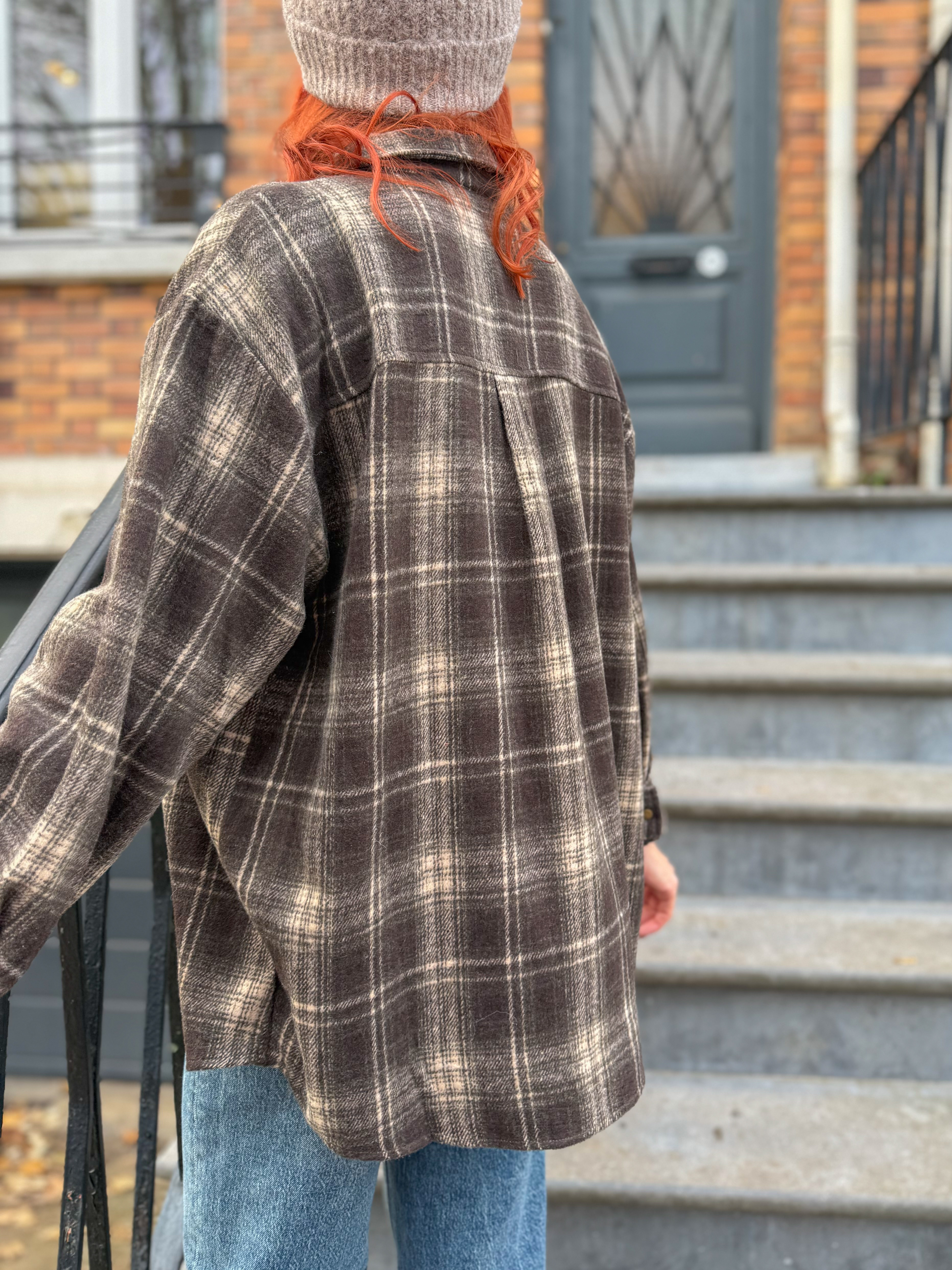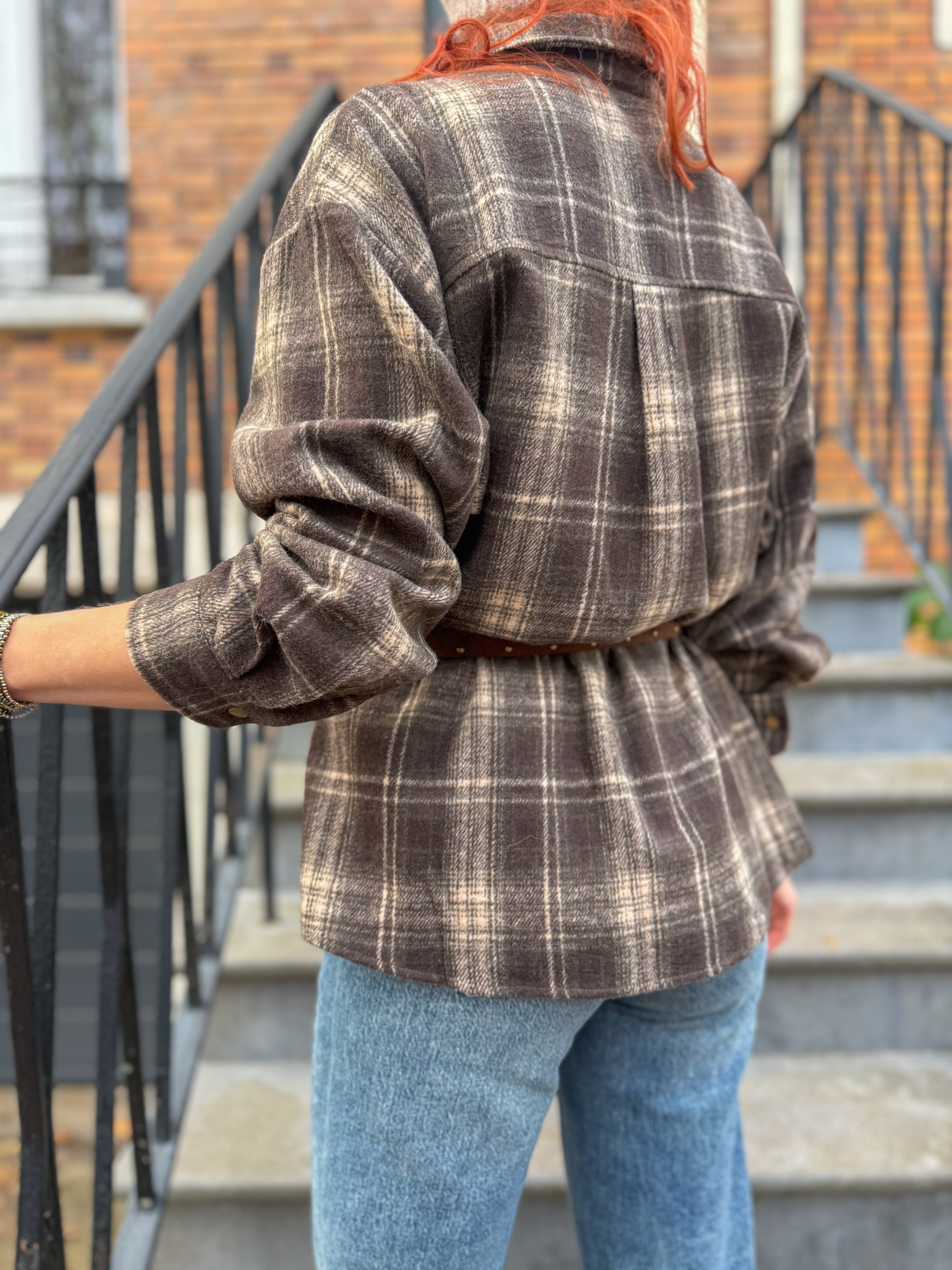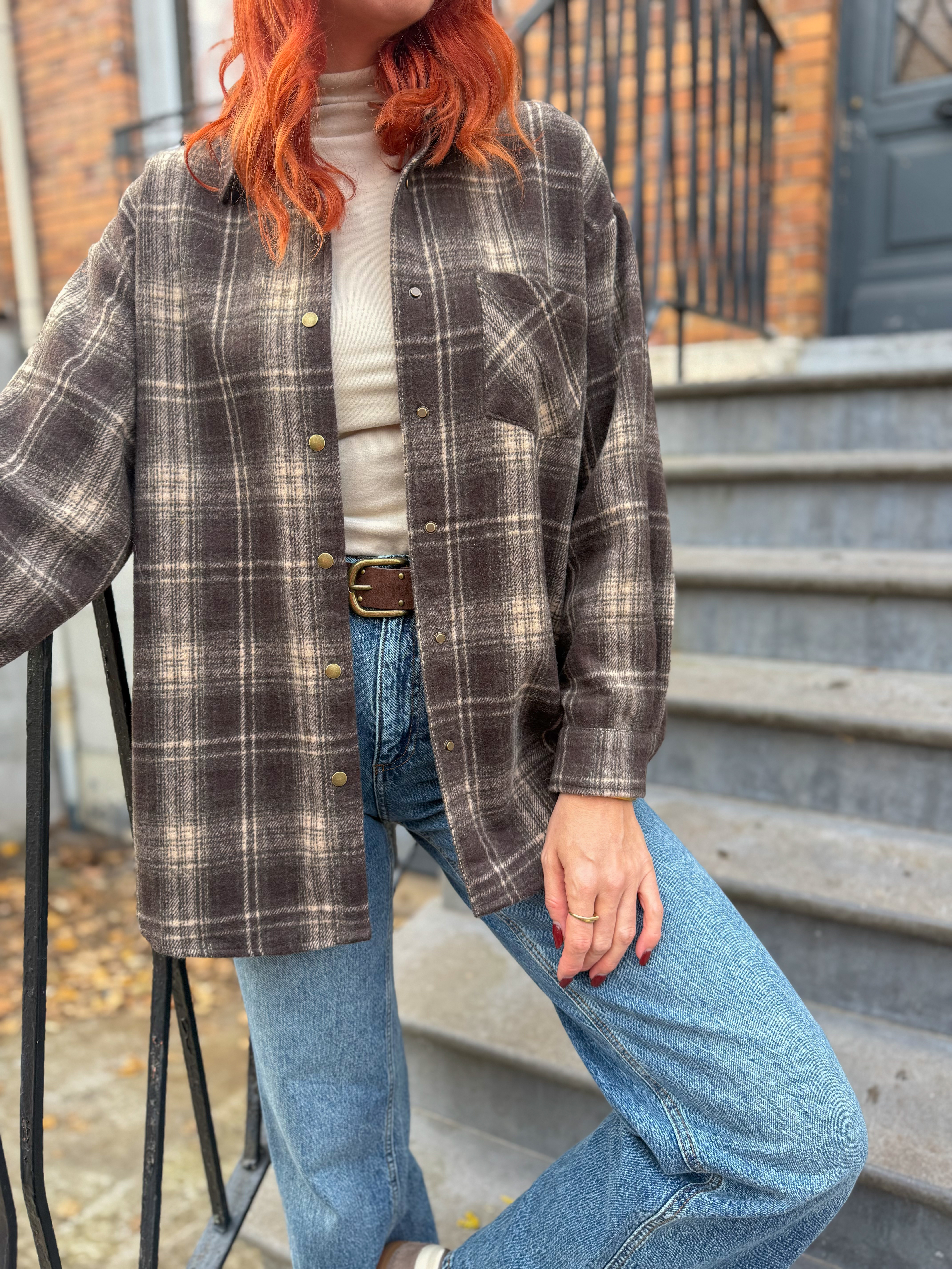 • Chemise oversize à carreaux marron et beige, coupe droite