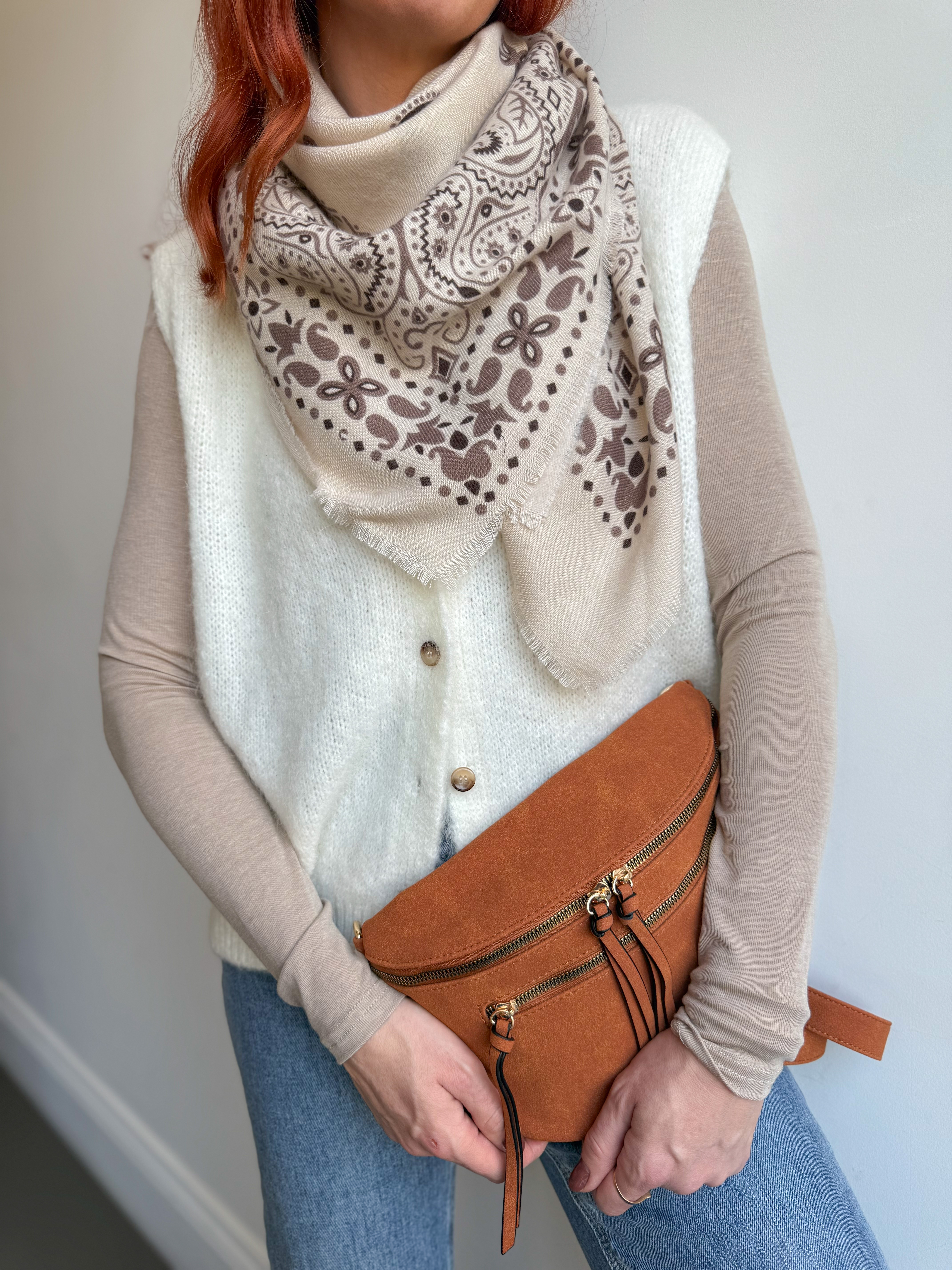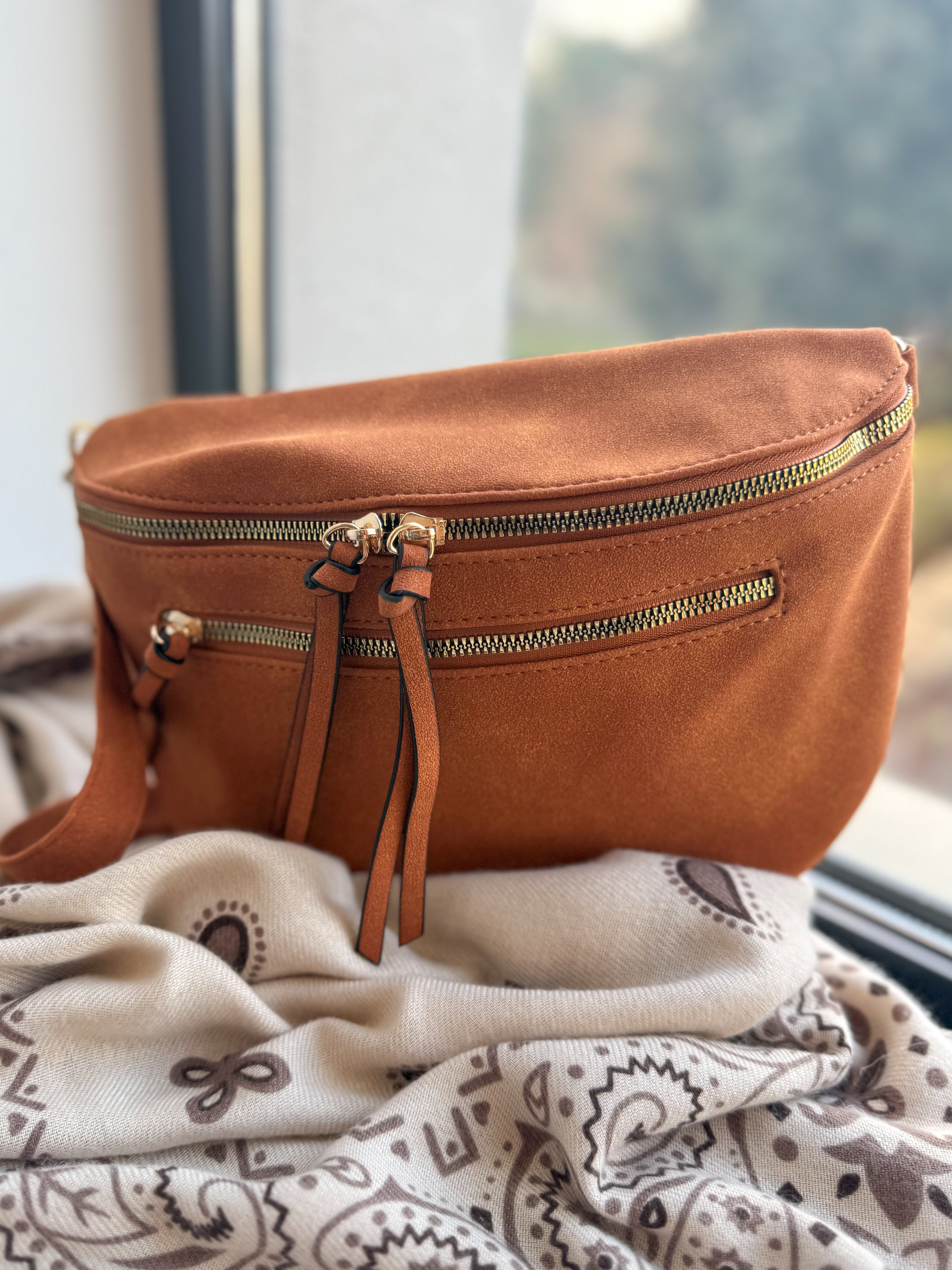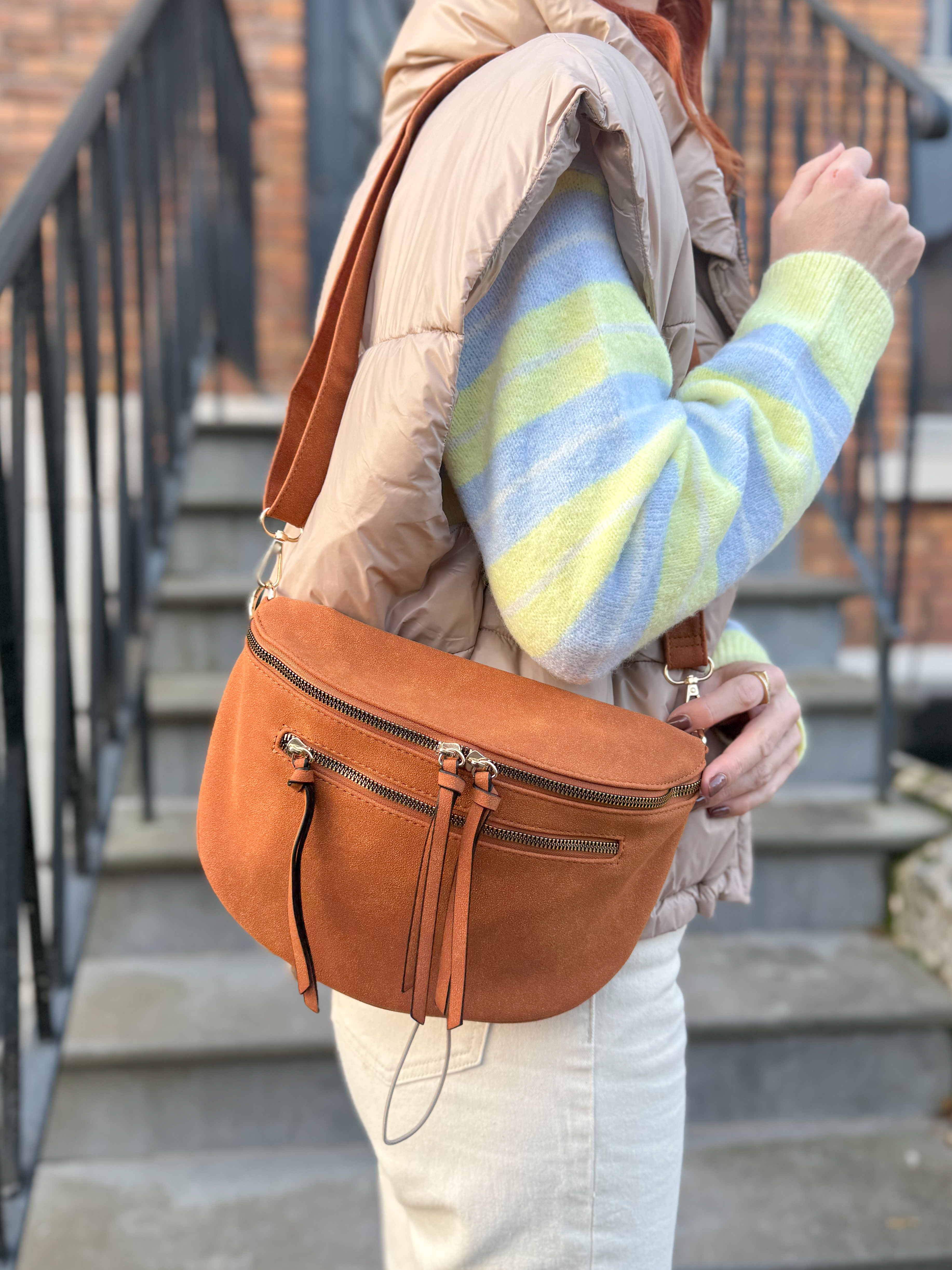 – Sac banane en suédine, coloris cognac, touché cuir doux
