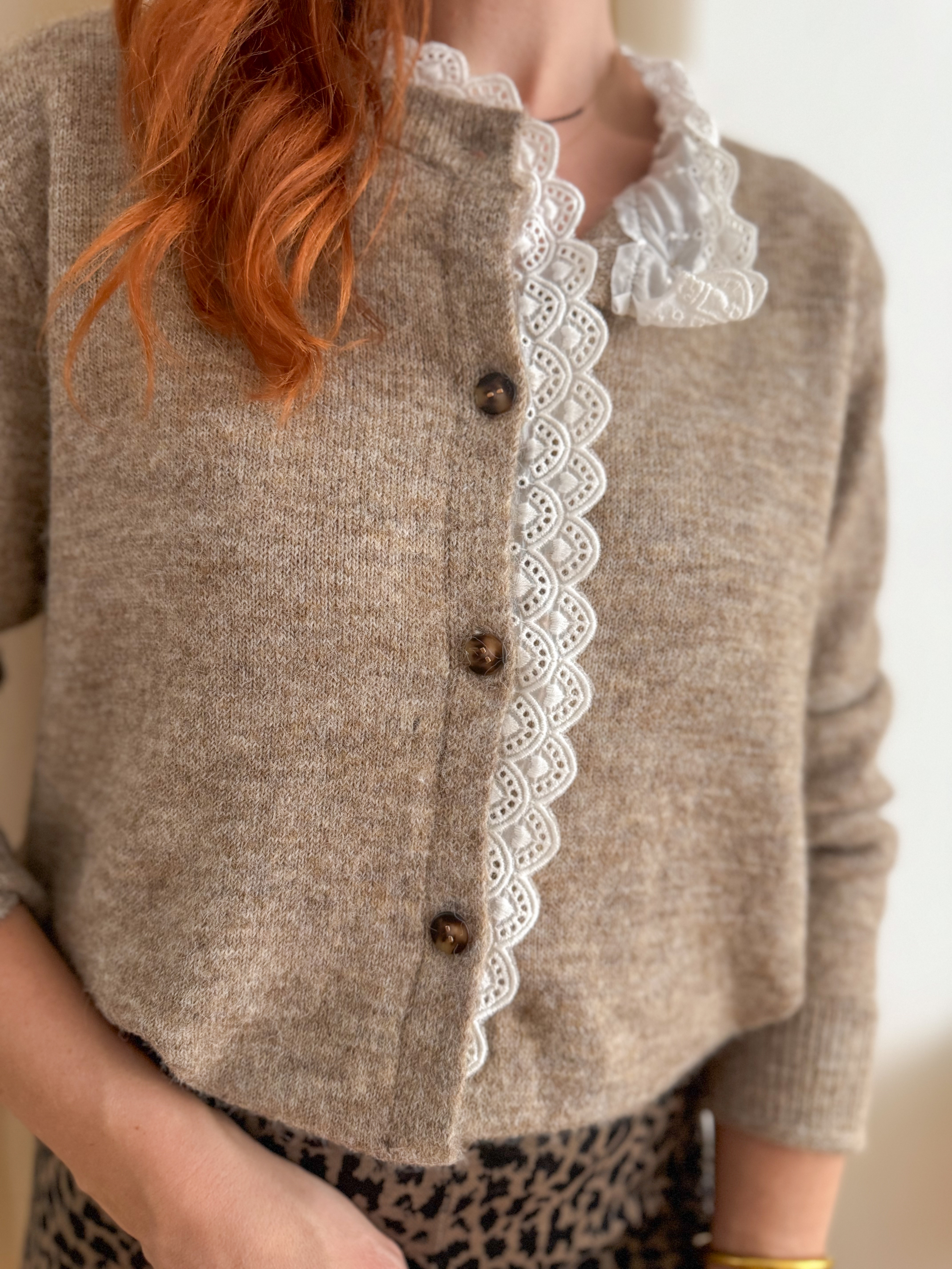 Son beau coloris taupe et sa finition en dentelle blanche lui donnent une allure à la fois douce et élégante.