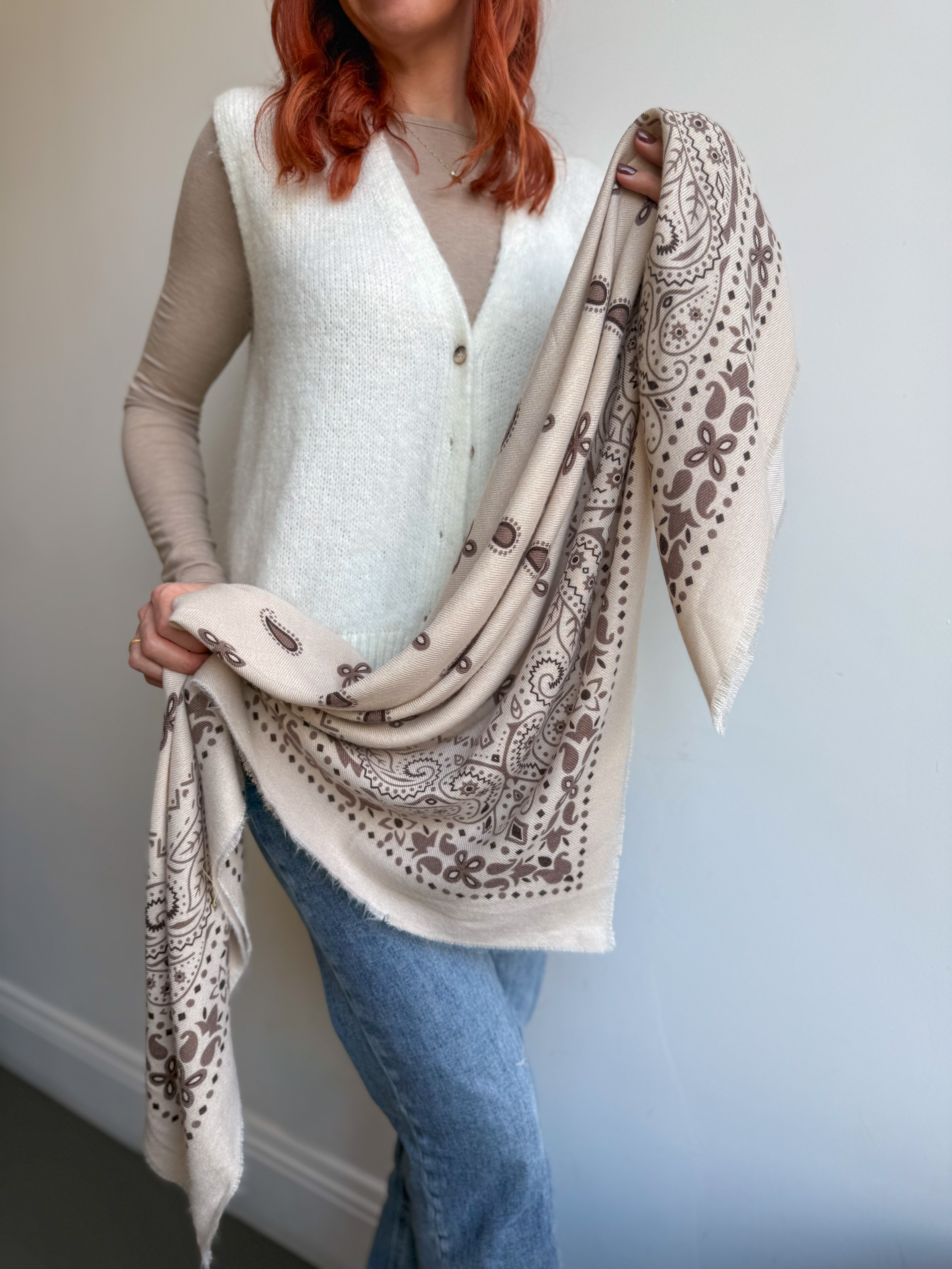 Son imprimé délicat aux tons beige et chocolat s’associe facilement à toutes vos tenues, tandis que sa matière en laine apporte chaleur et confort sans alourdir la silhouette.