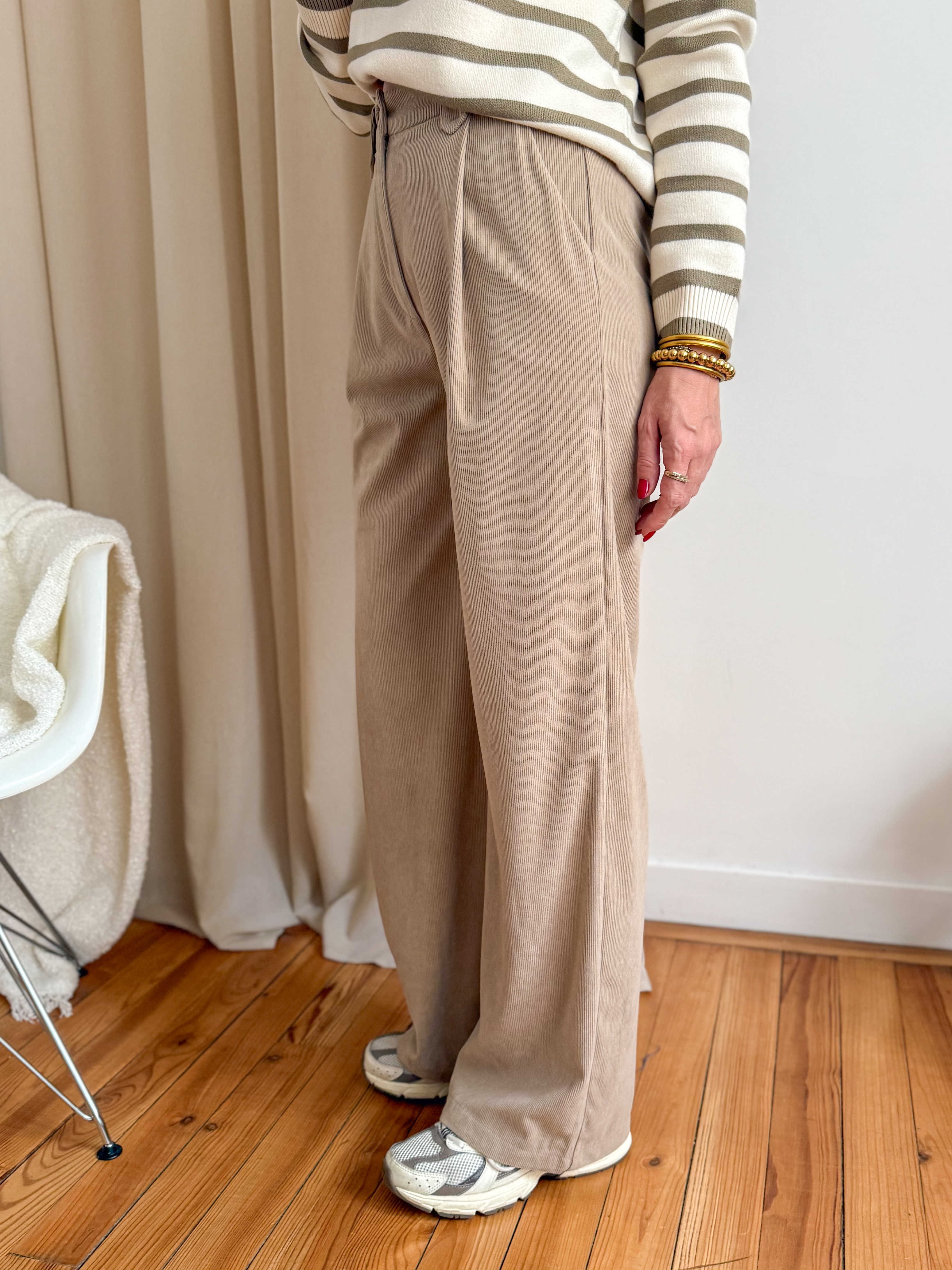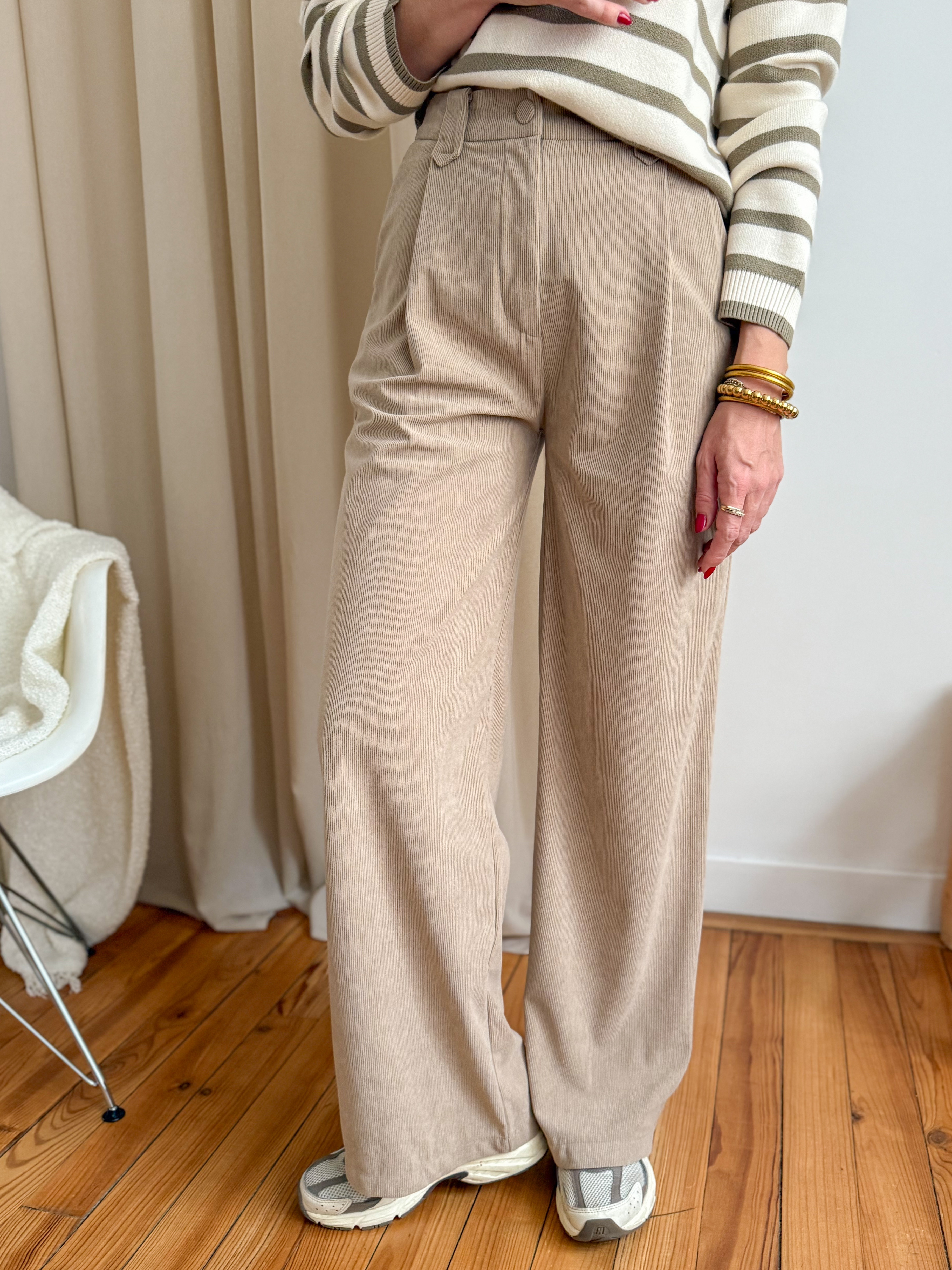 Avec sa coupe fluide et son velours finement côtelé, il apporte une touche rétro et tendance à vos looks de saison.