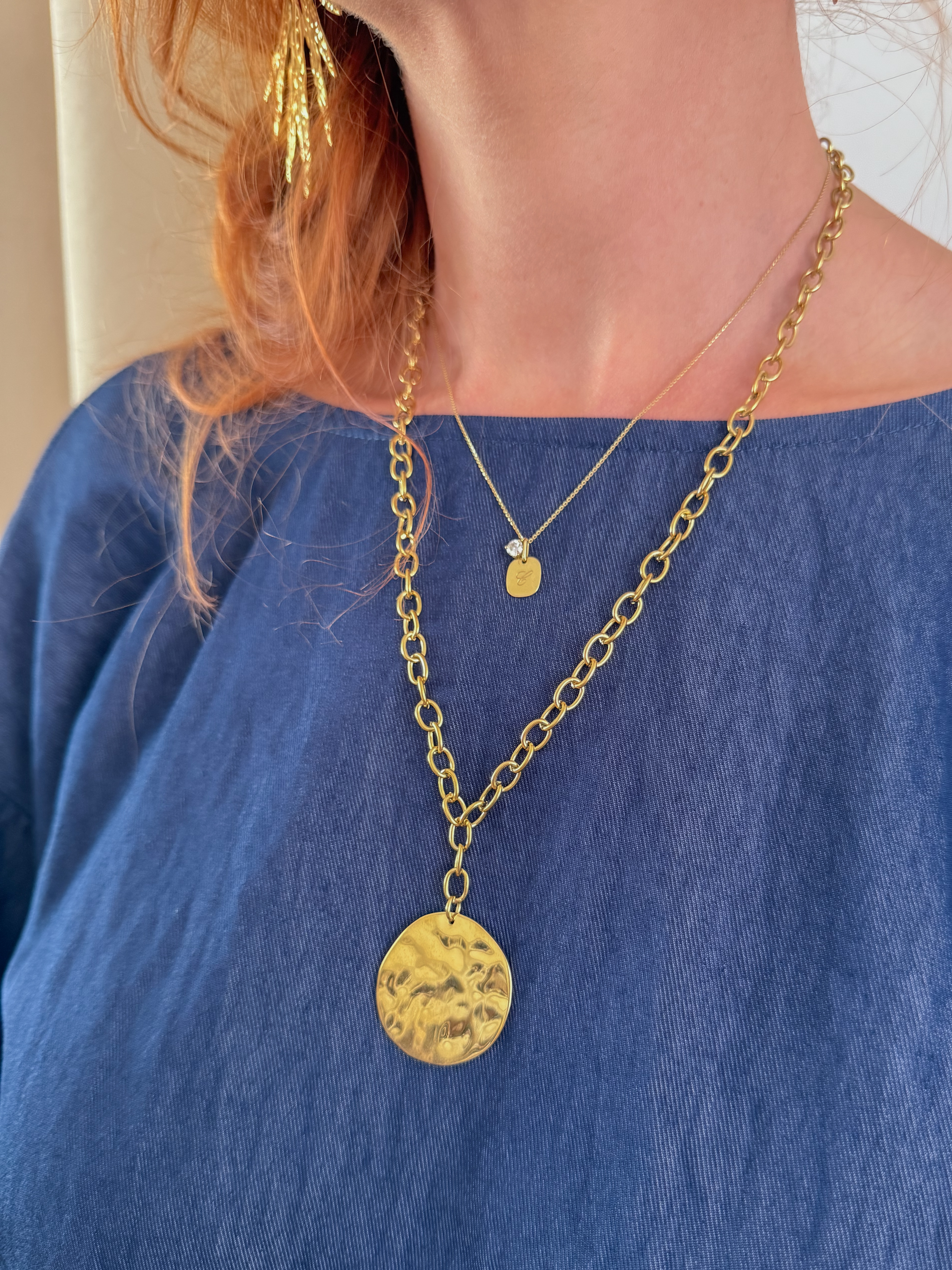 Son chaînage épais et son pendentif martelé en font un accessoire moderne et raffiné, parfait pour sublimer toutes vos tenues.