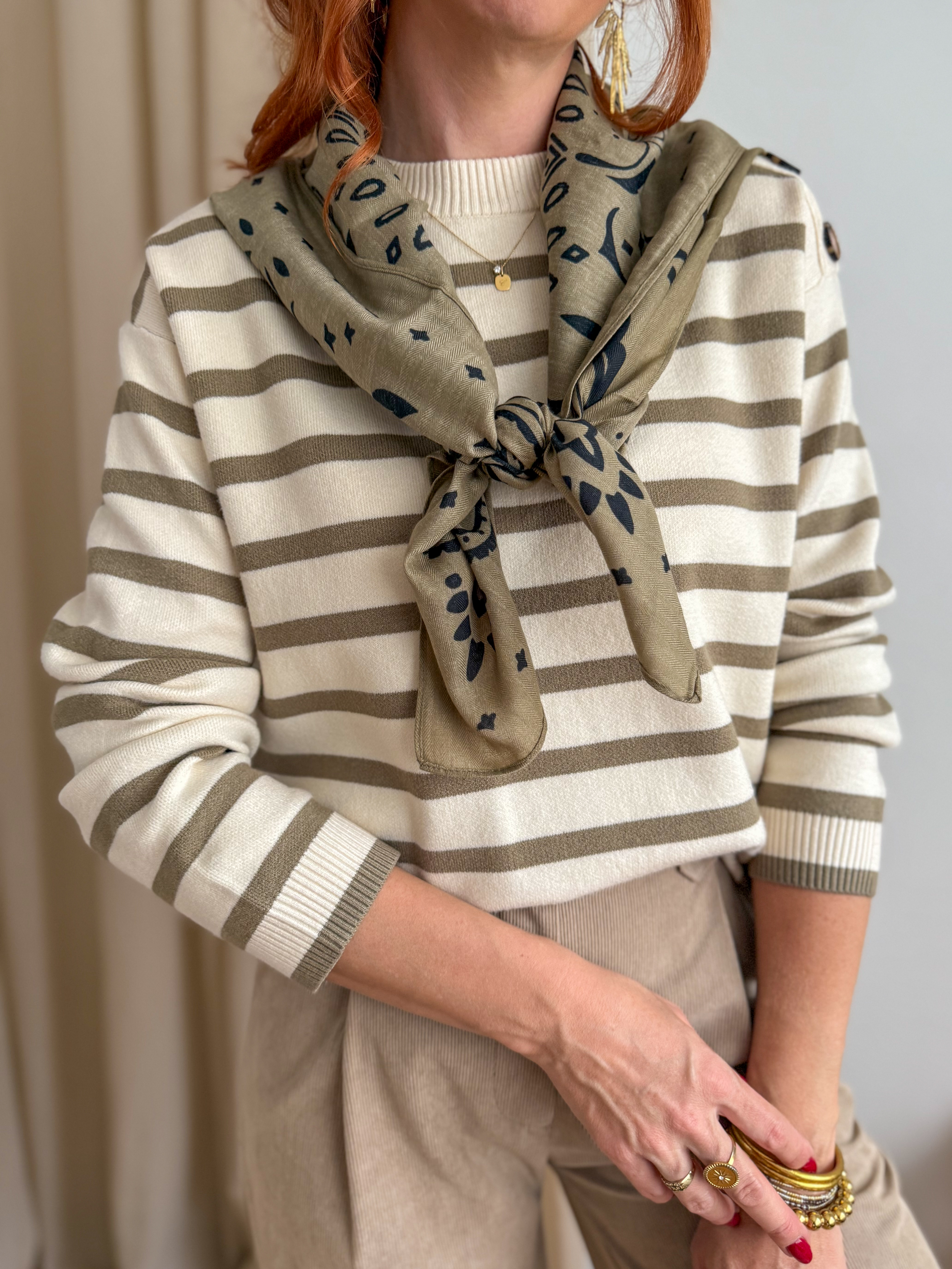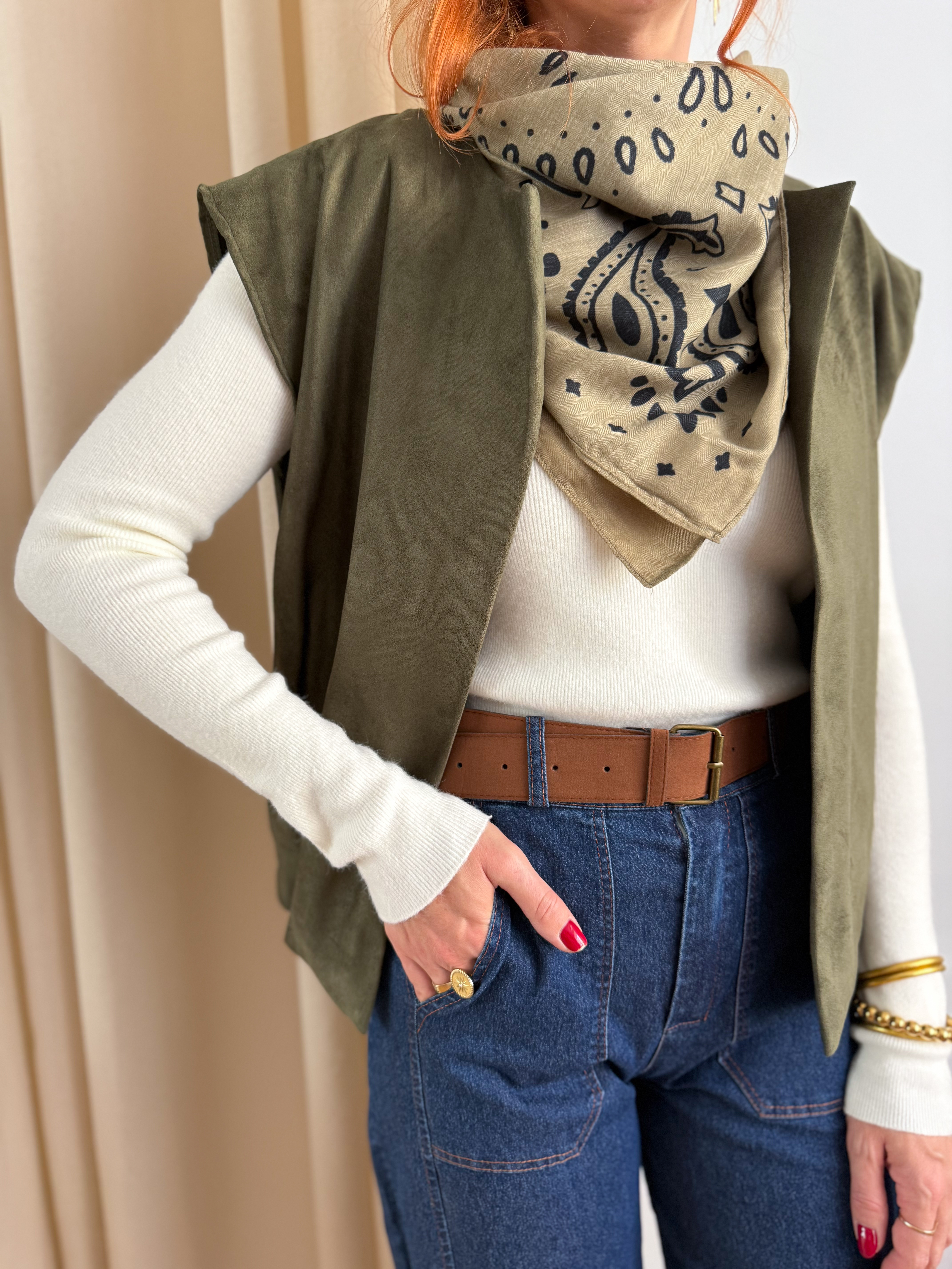 Avec son imprimé bandana intemporel et son format carré, notre écharpe kaki est l’accessoire parfait pour twister vos tenues.