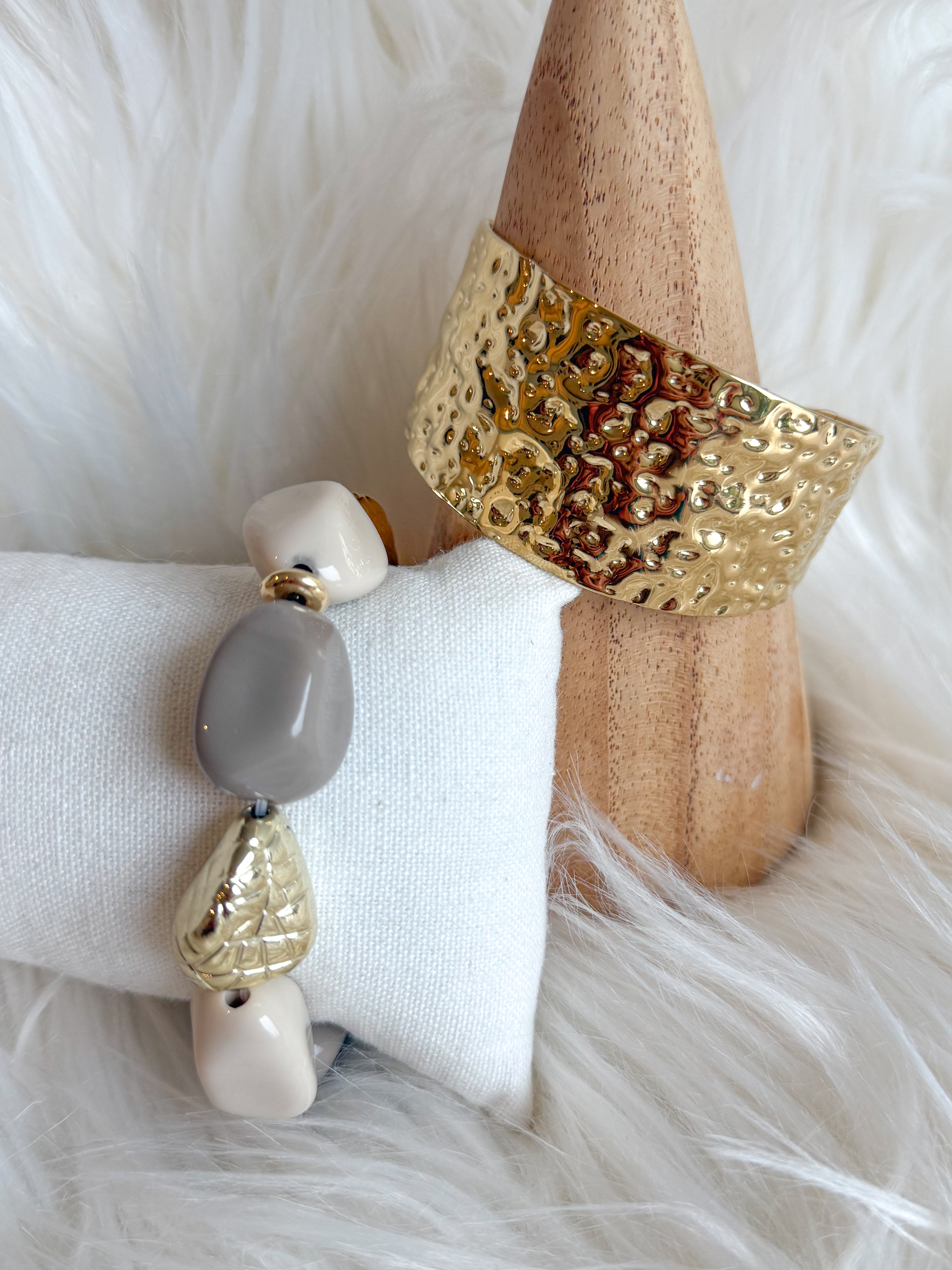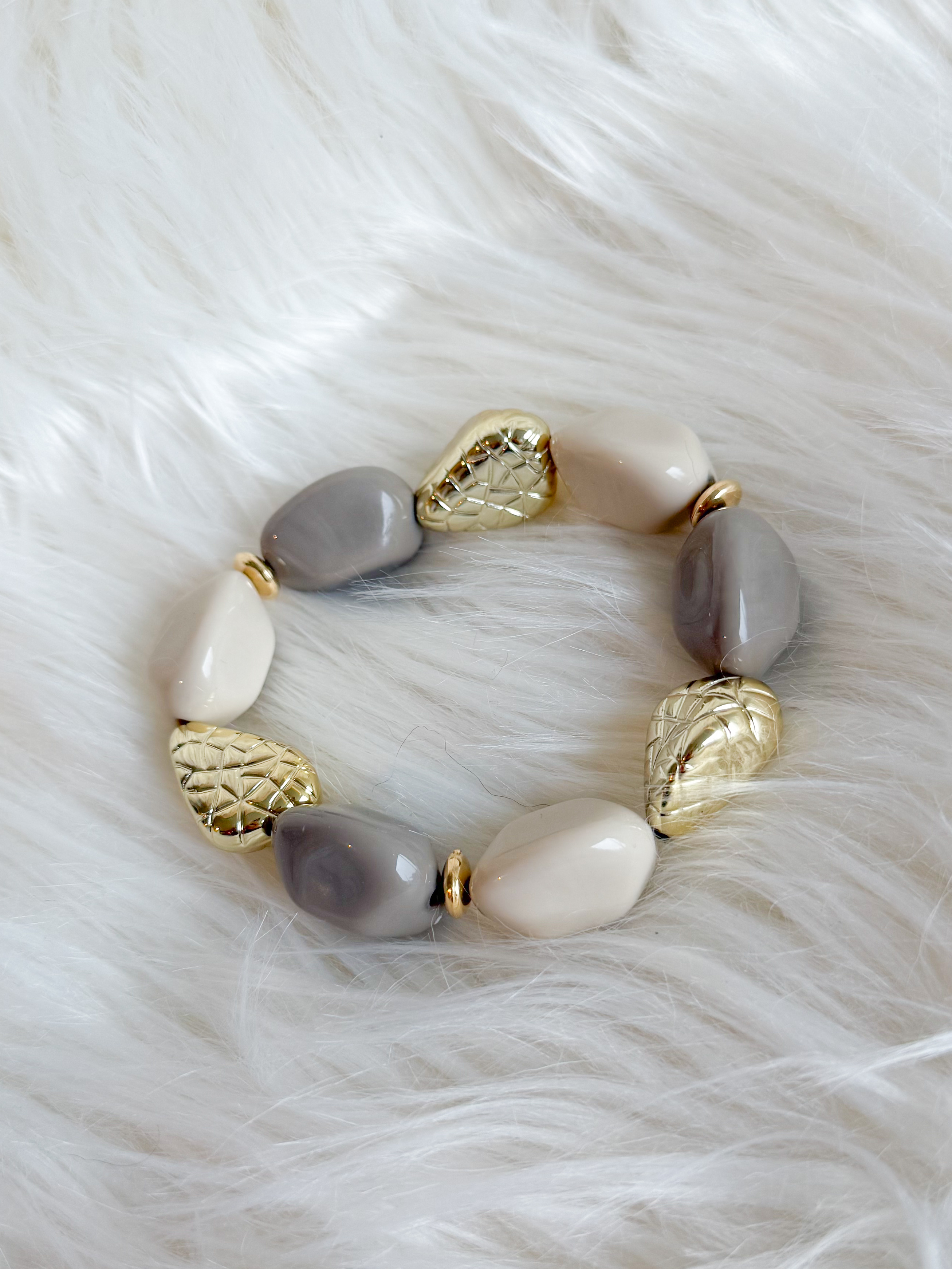 – Bracelet élastiqué composé de perles aux tons écru et gris, rehaussé de détails dorés