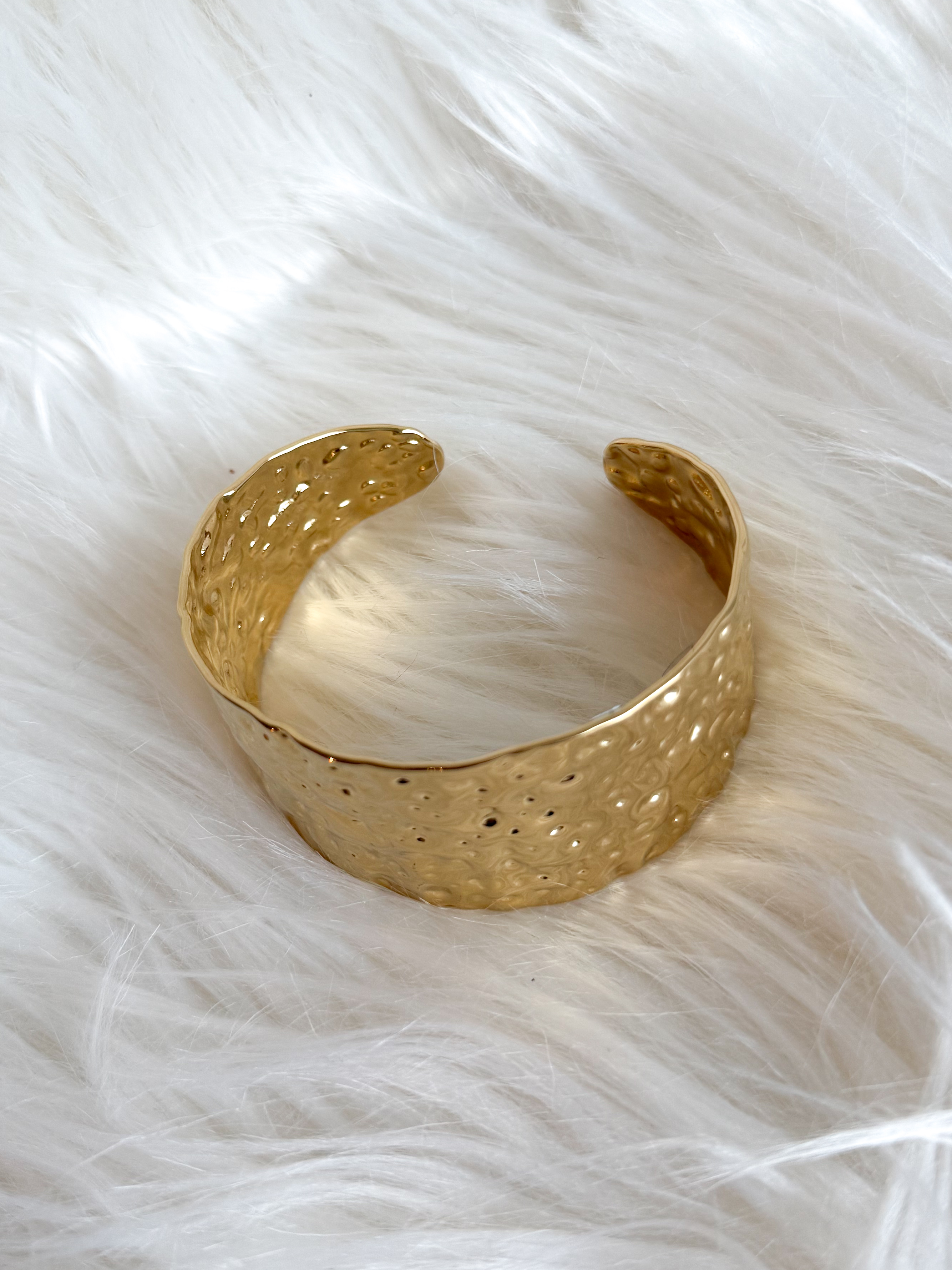 – Bracelet jonc doré martelé, rigide et ouvert, avec un effet texturé
