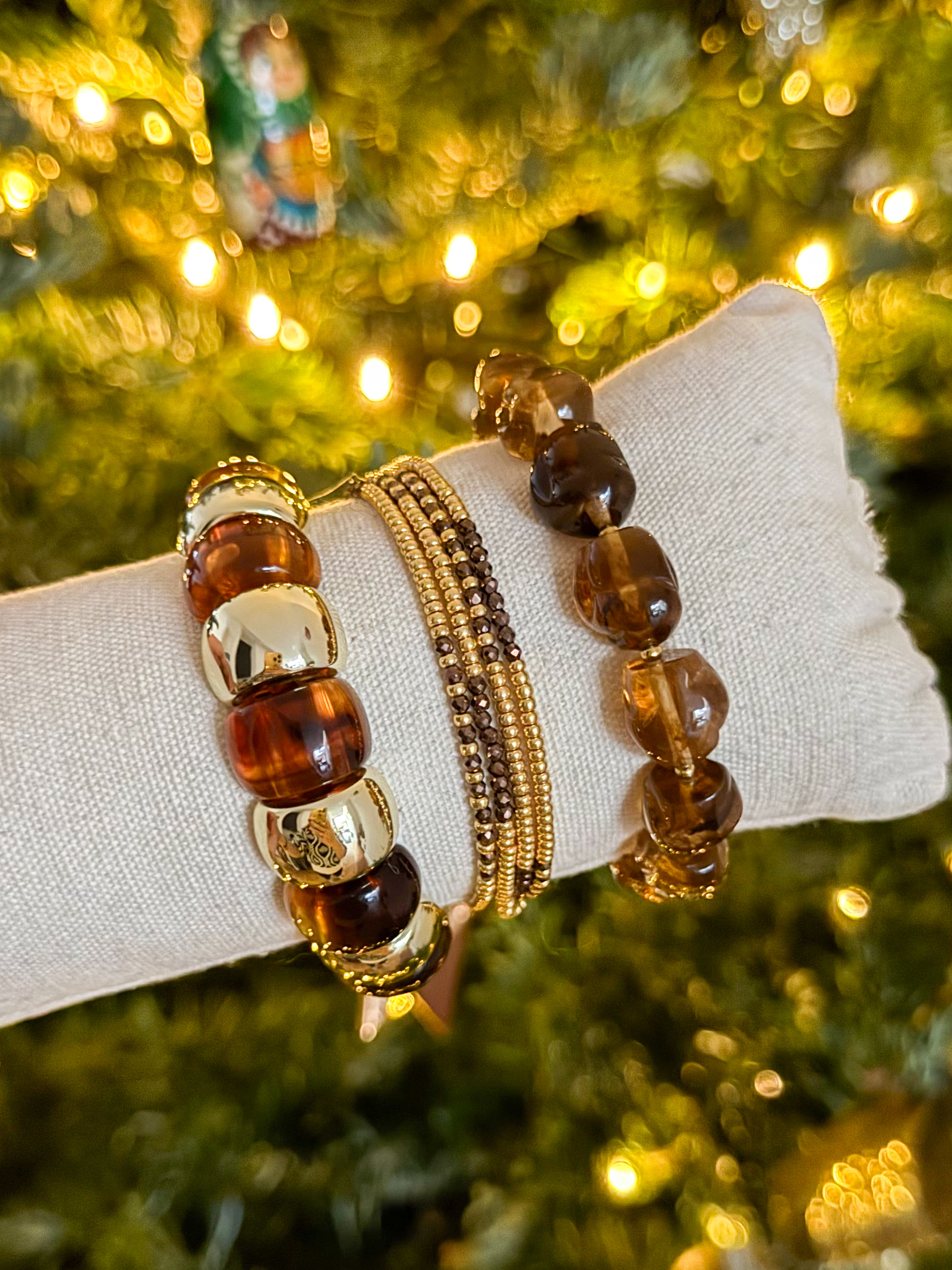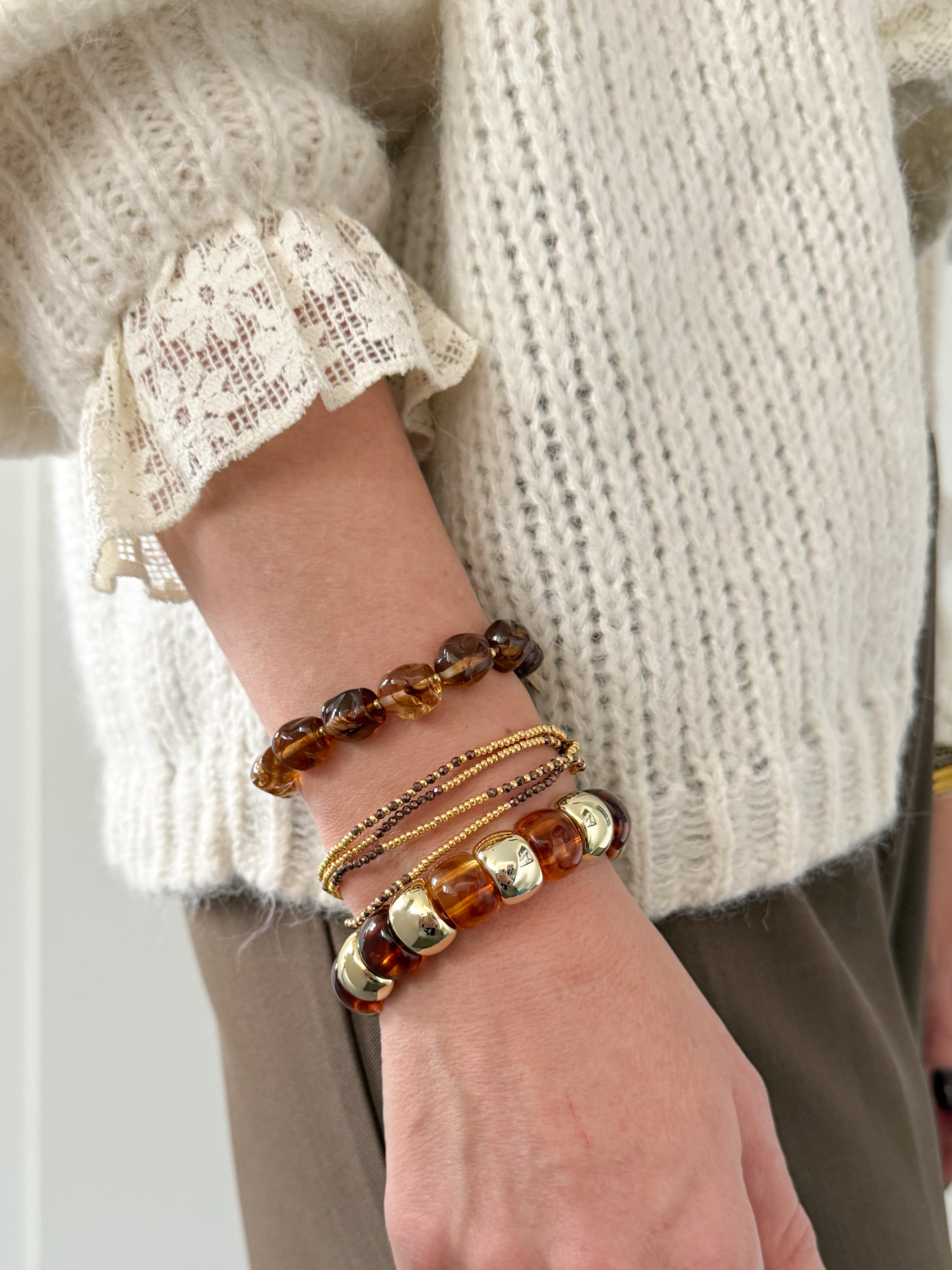 À la fois faciles à porter et ultra chic, ils apportent immédiatement du caractère au poignet grâce au mélange de perles dorées, de brun caramel et d’effets transparents.