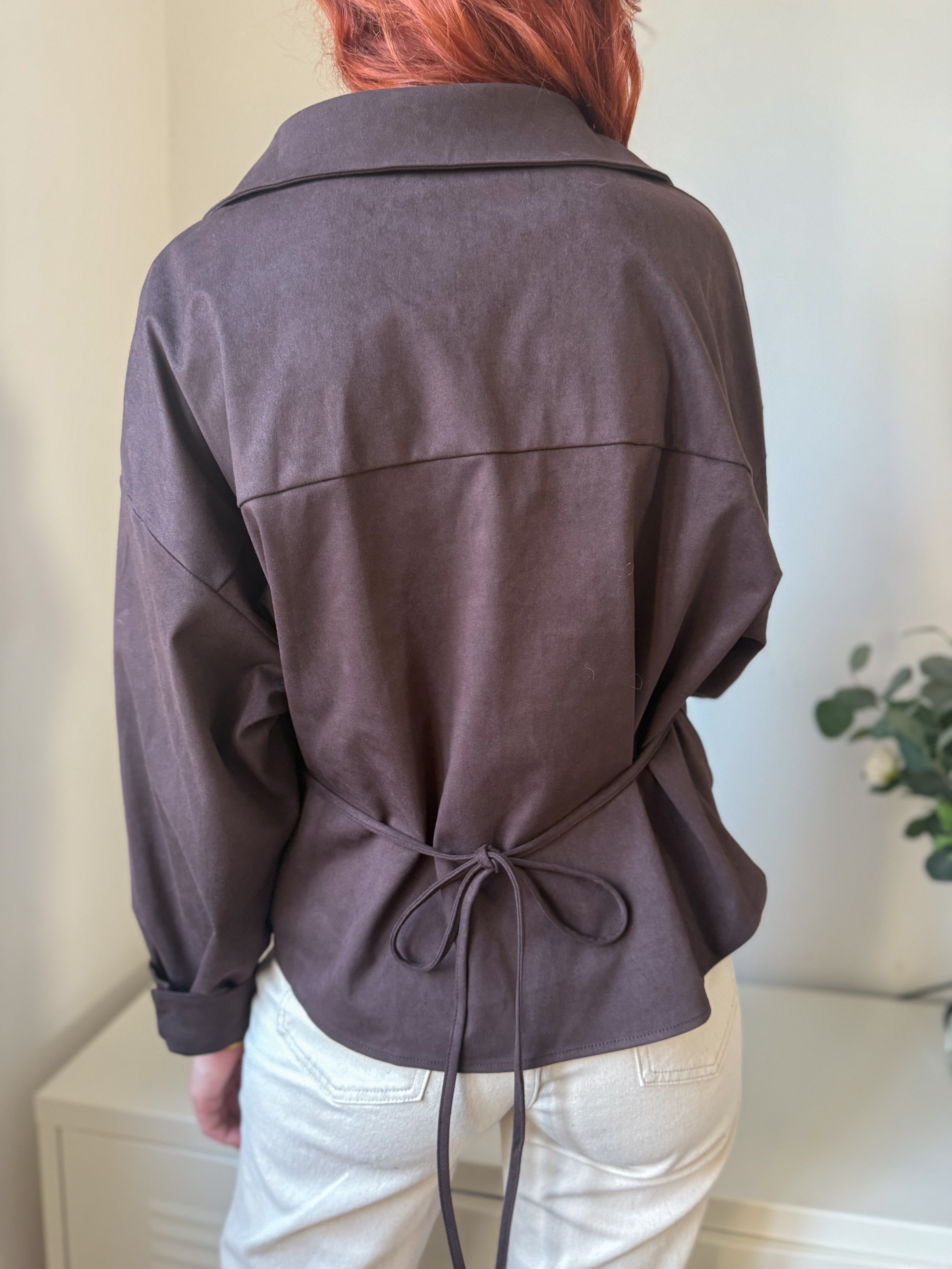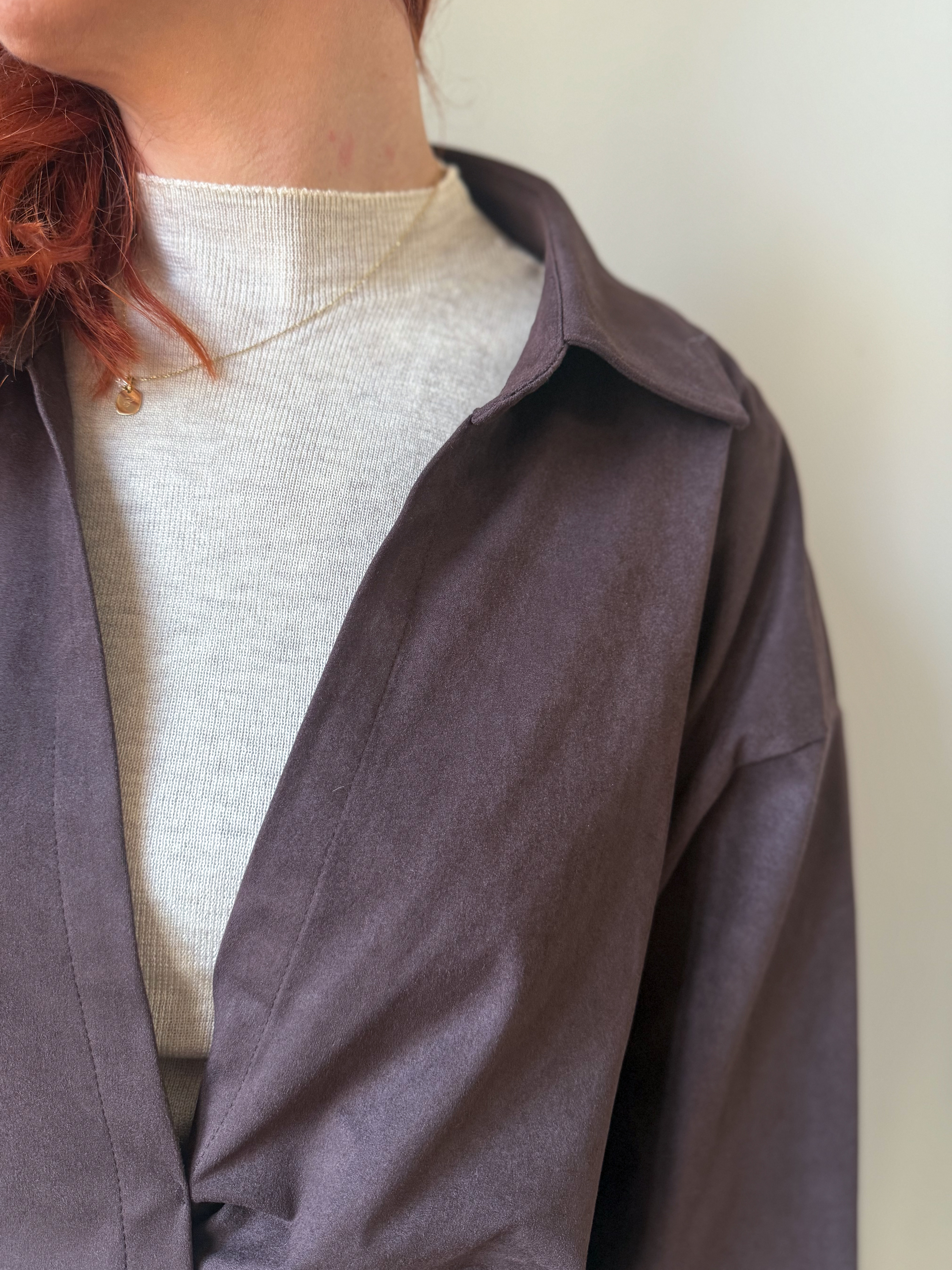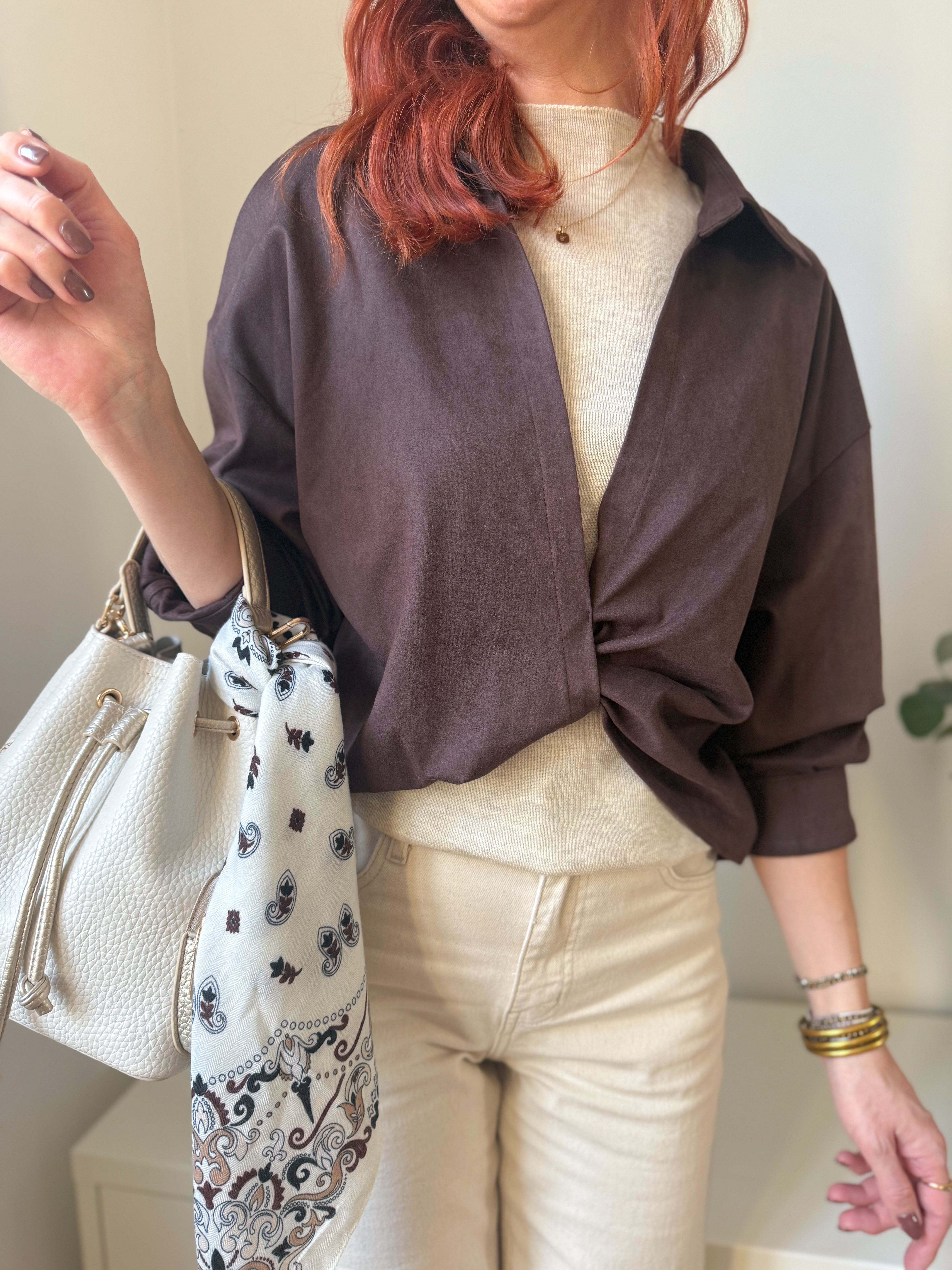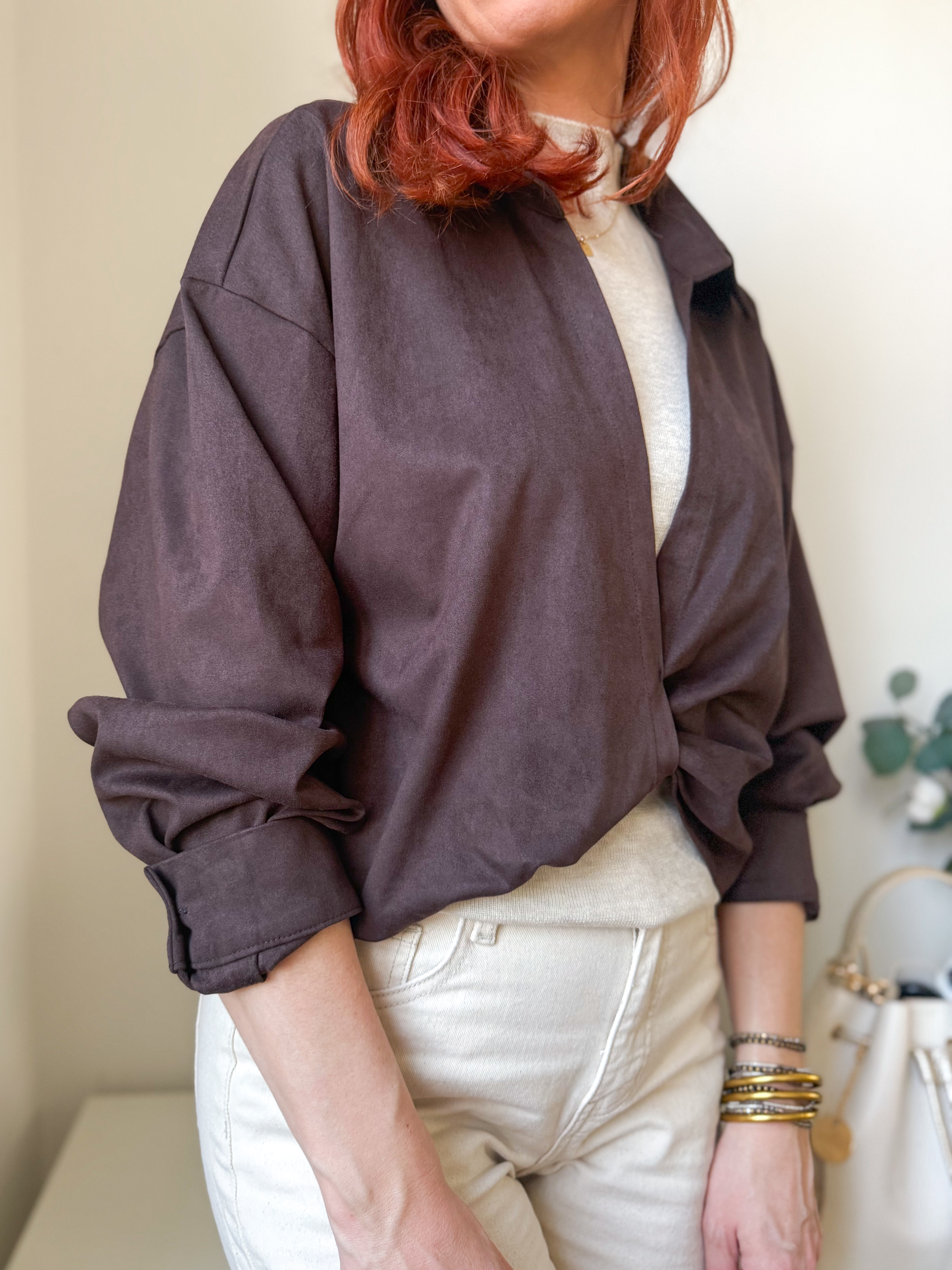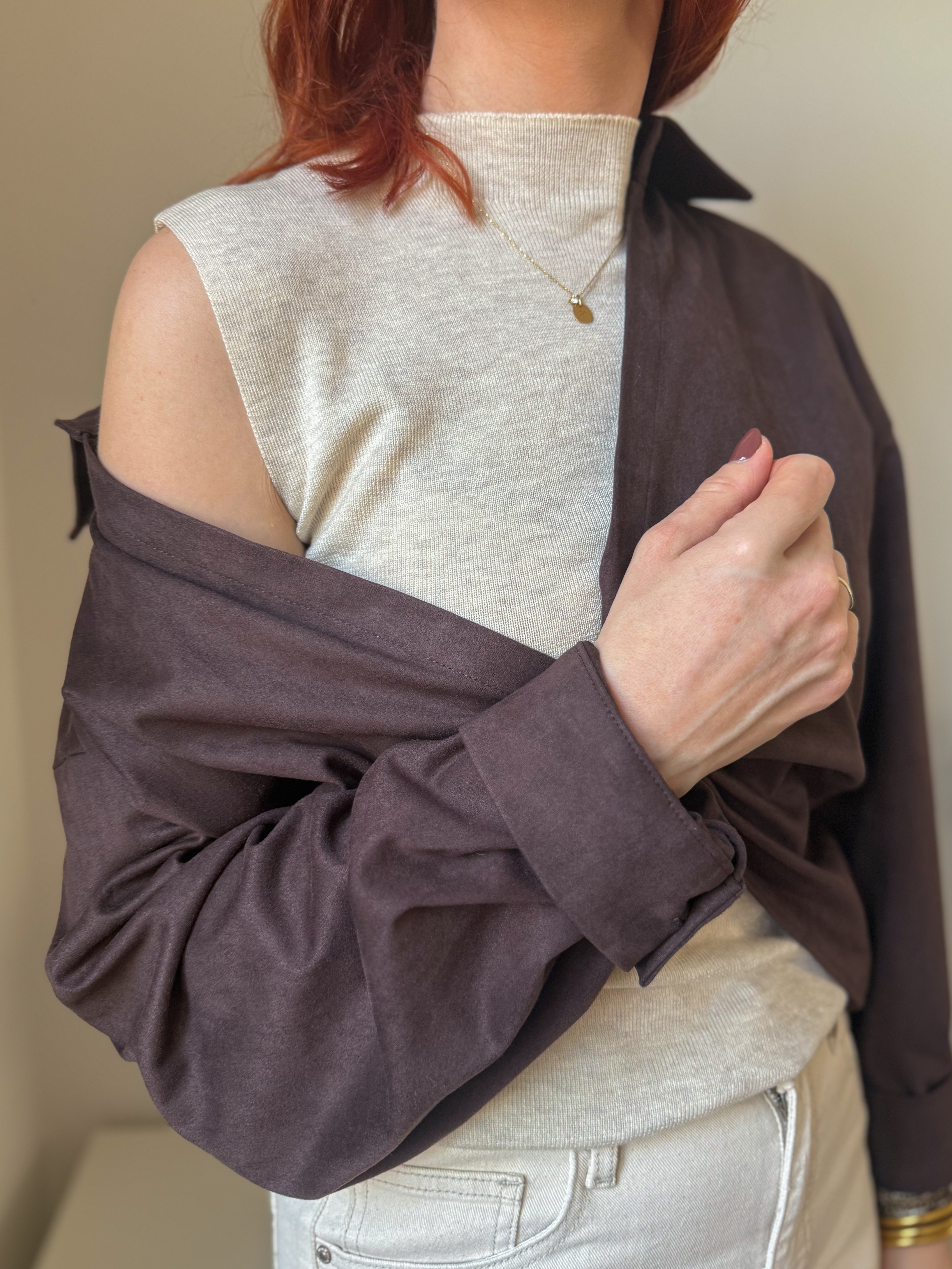 notre ensemble se compose d’un pull fin sans manches et d’une veste torsadée en suédine chocolat