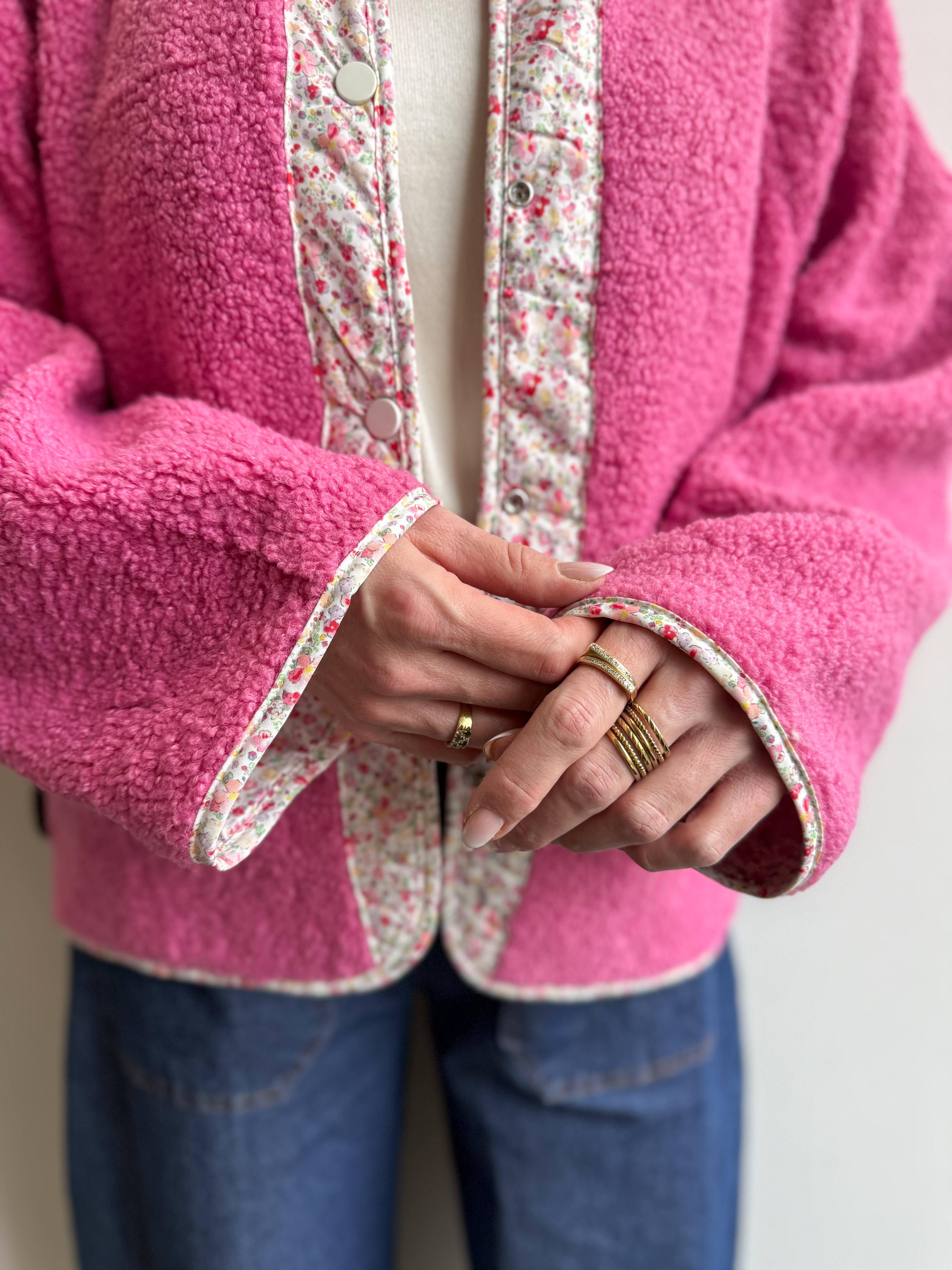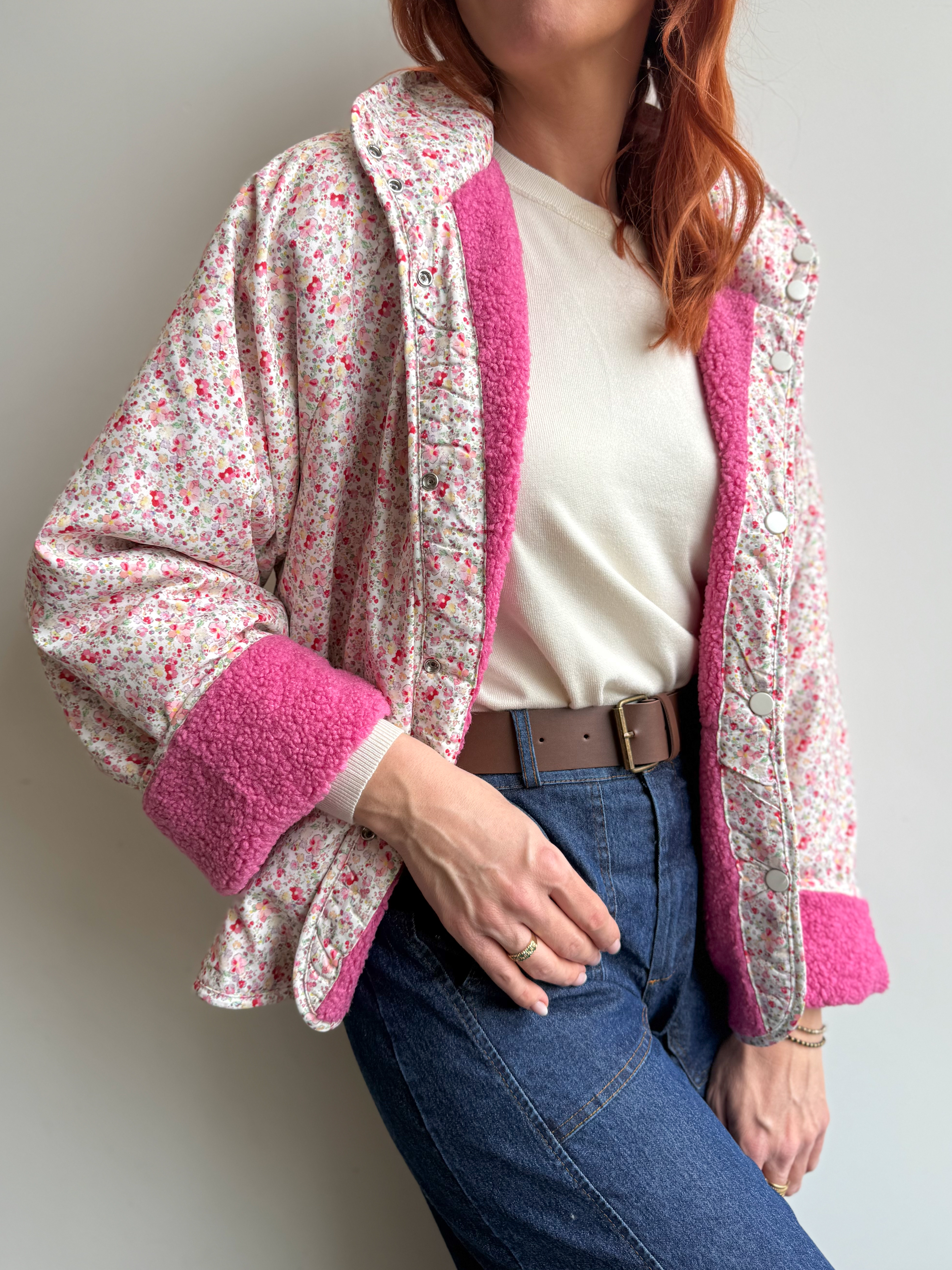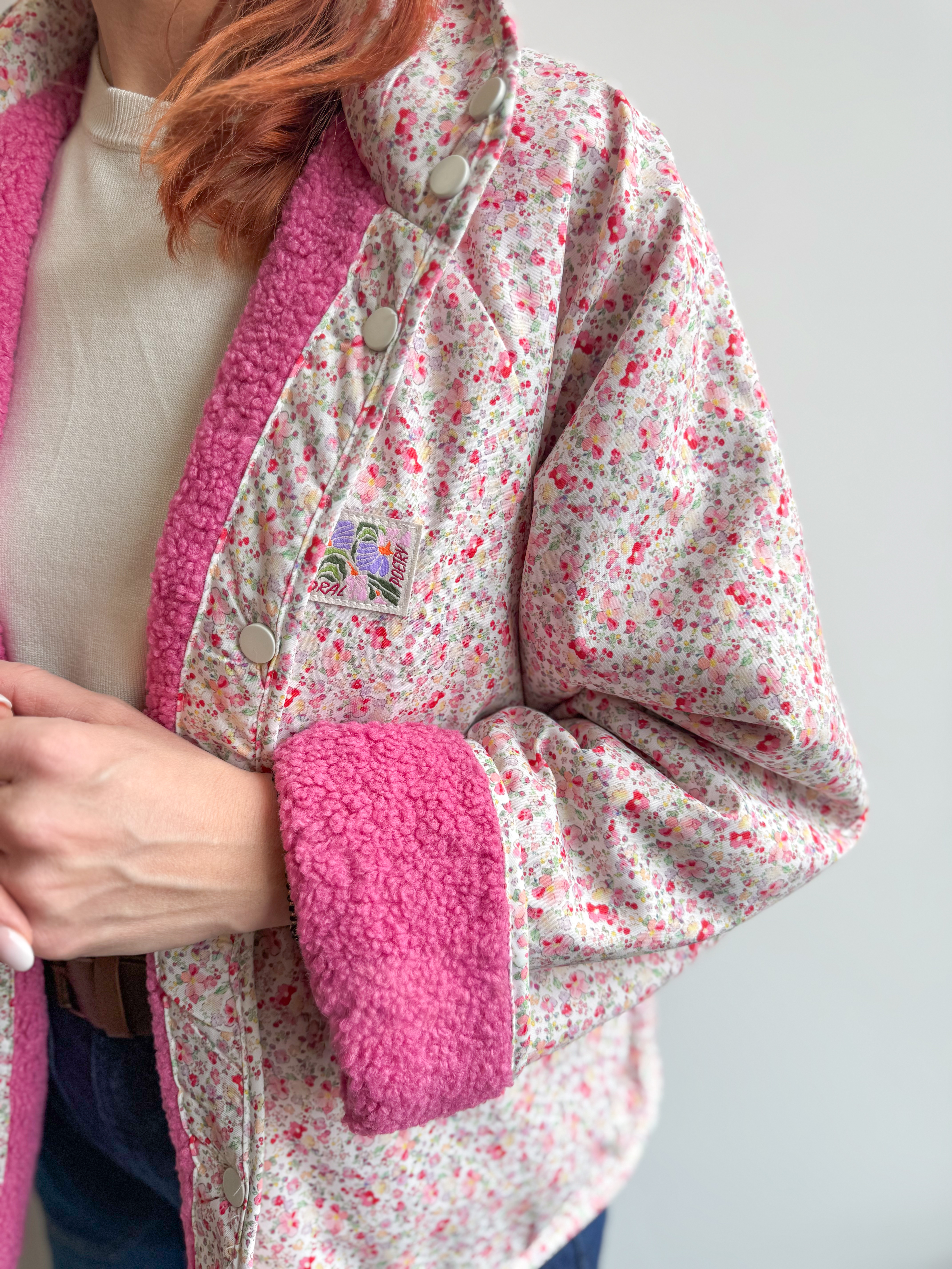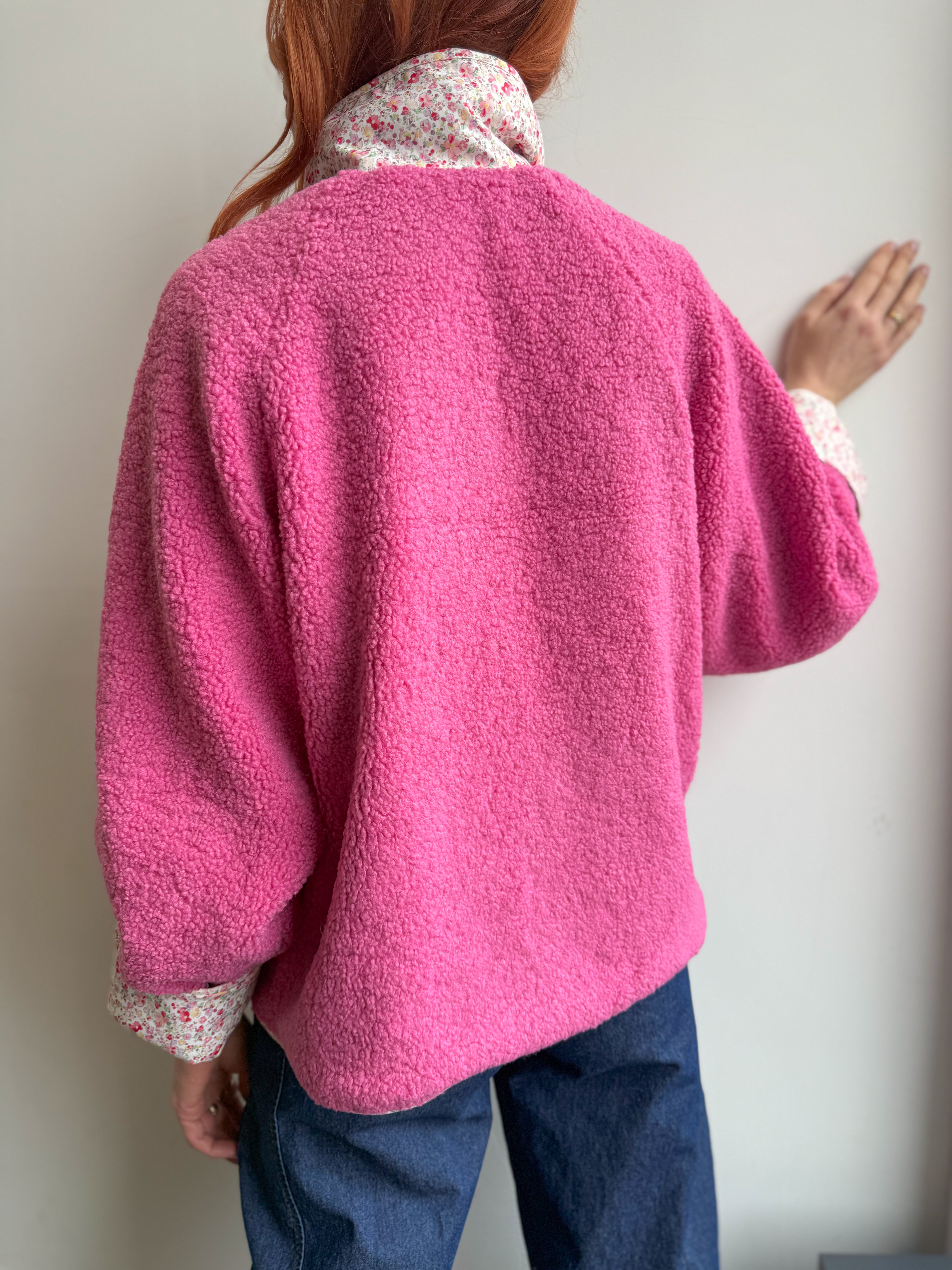 – Réversible : un côté en matière moutonnée rose et l’autre en liberty