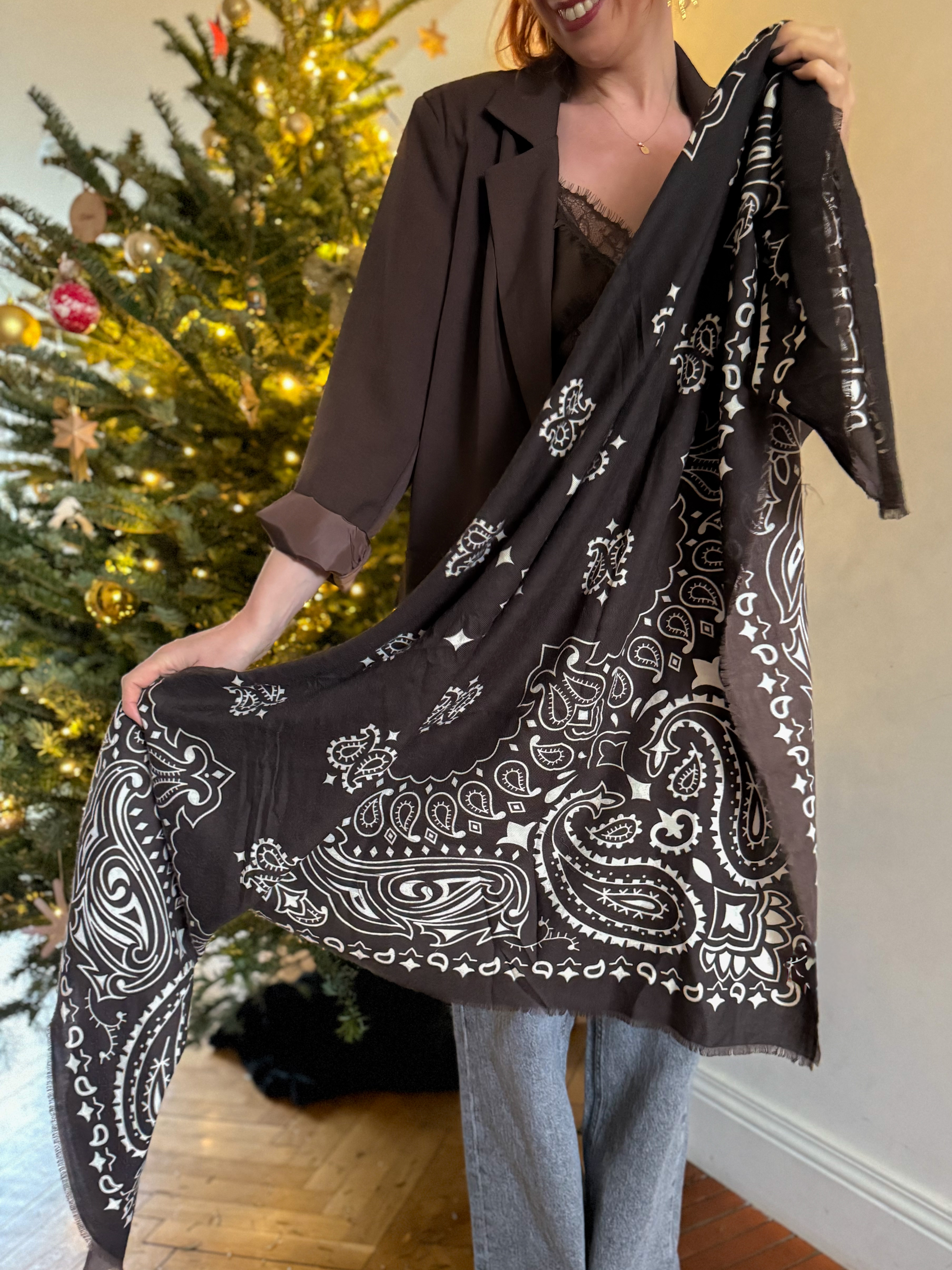 Avec son grand format, ses motifs contrastés et sa matière douce, cette écharpe apporte une touche bohème chic tout en restant facile à porter au quotidien.