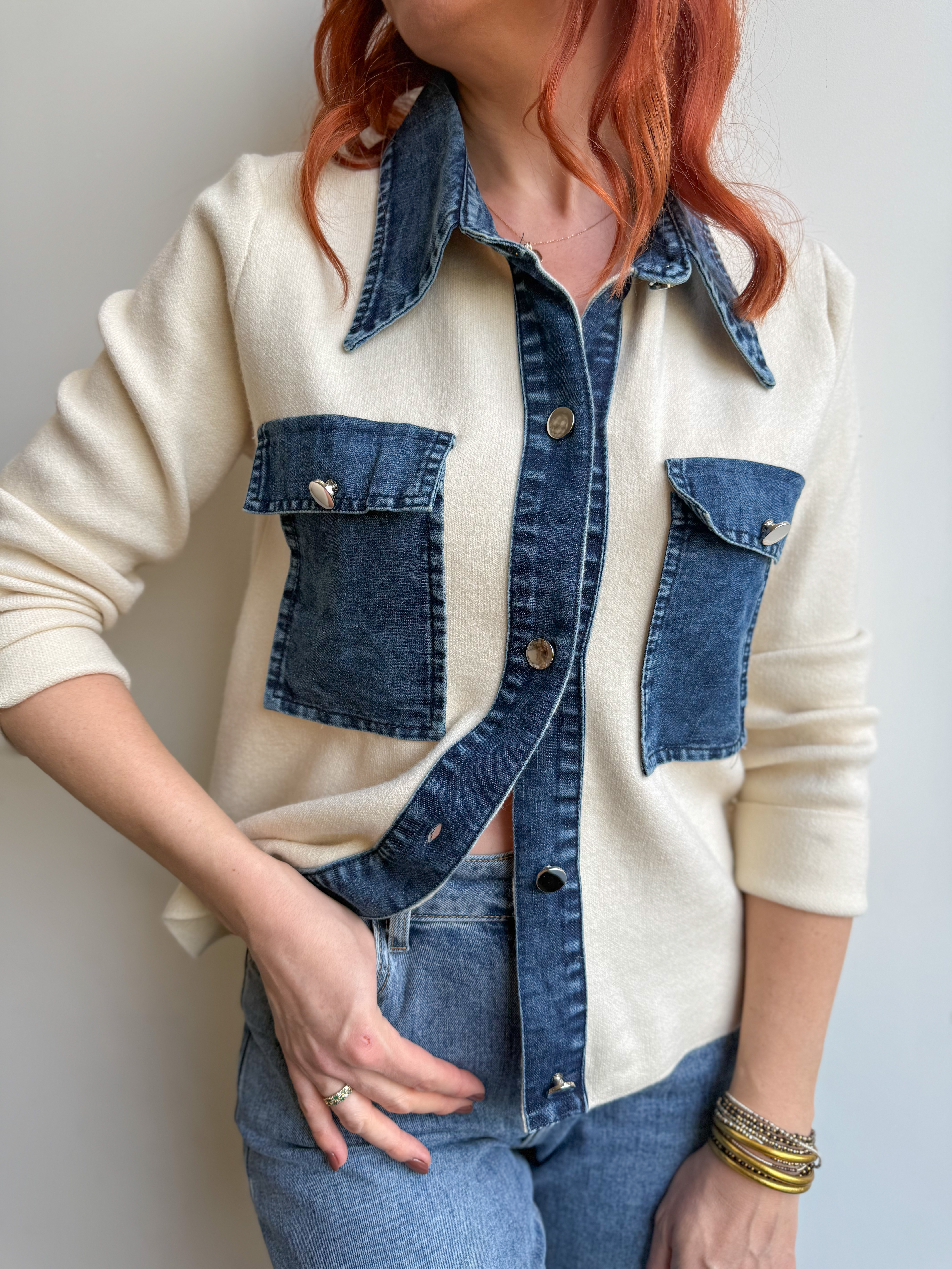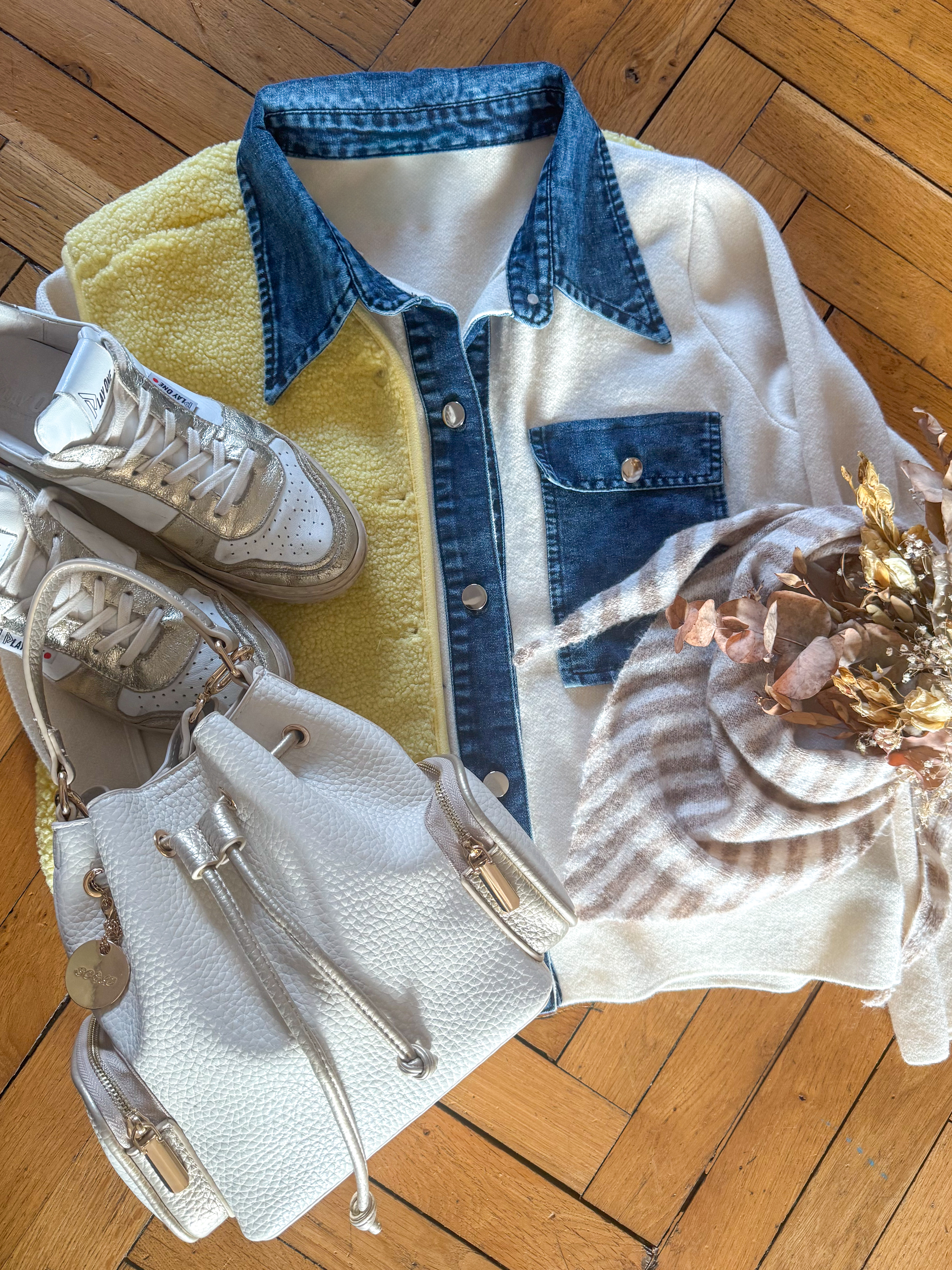 Notre pull Jacky bi-matière, c’est le genre de pièce qu’on enfile sans réfléchir et qui fait tout le look à elle seule.