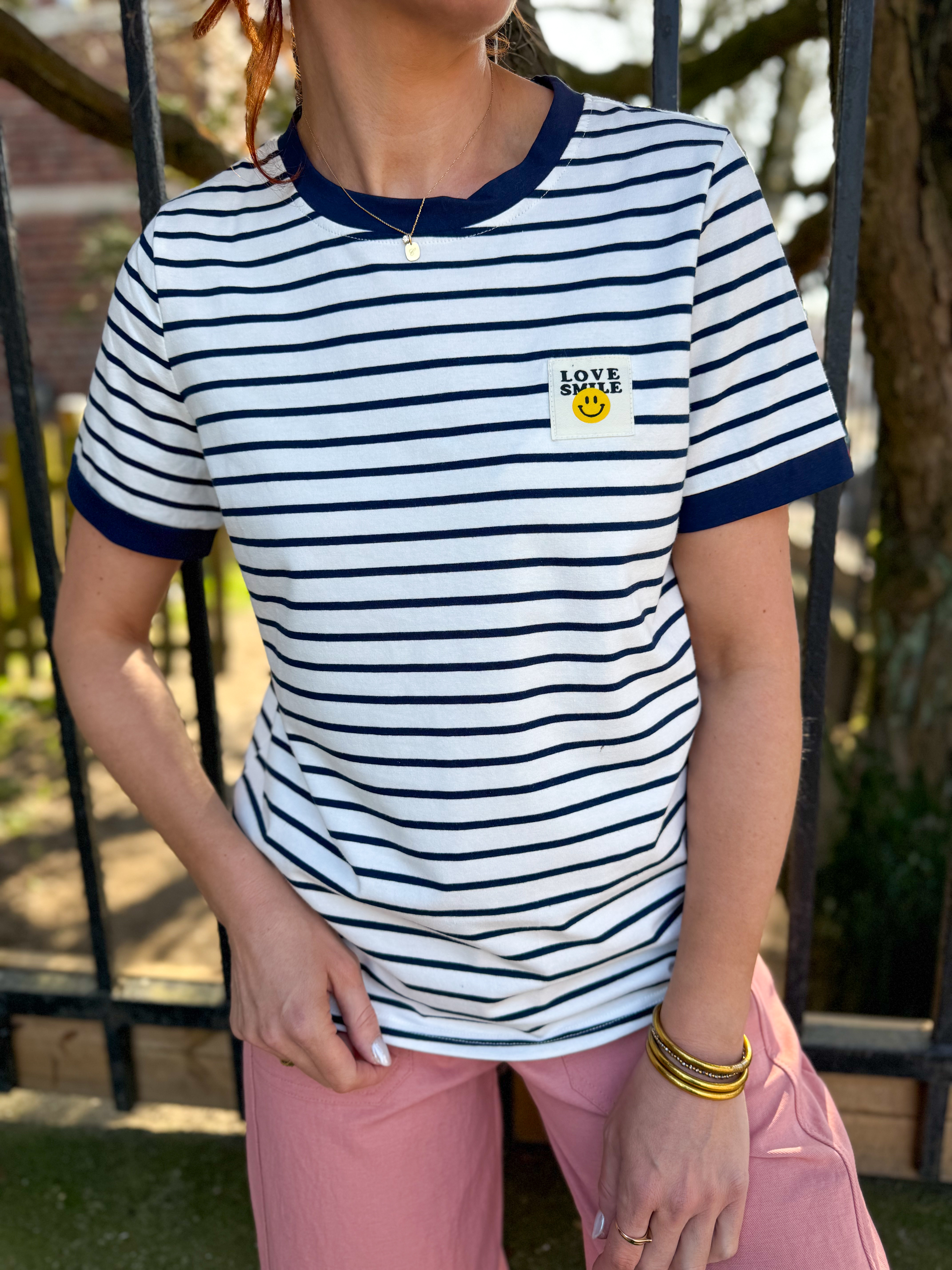 Notre tee-shirt Jean revisite le classique marinière avec une touche fun grâce à son patch “Love Smile”.