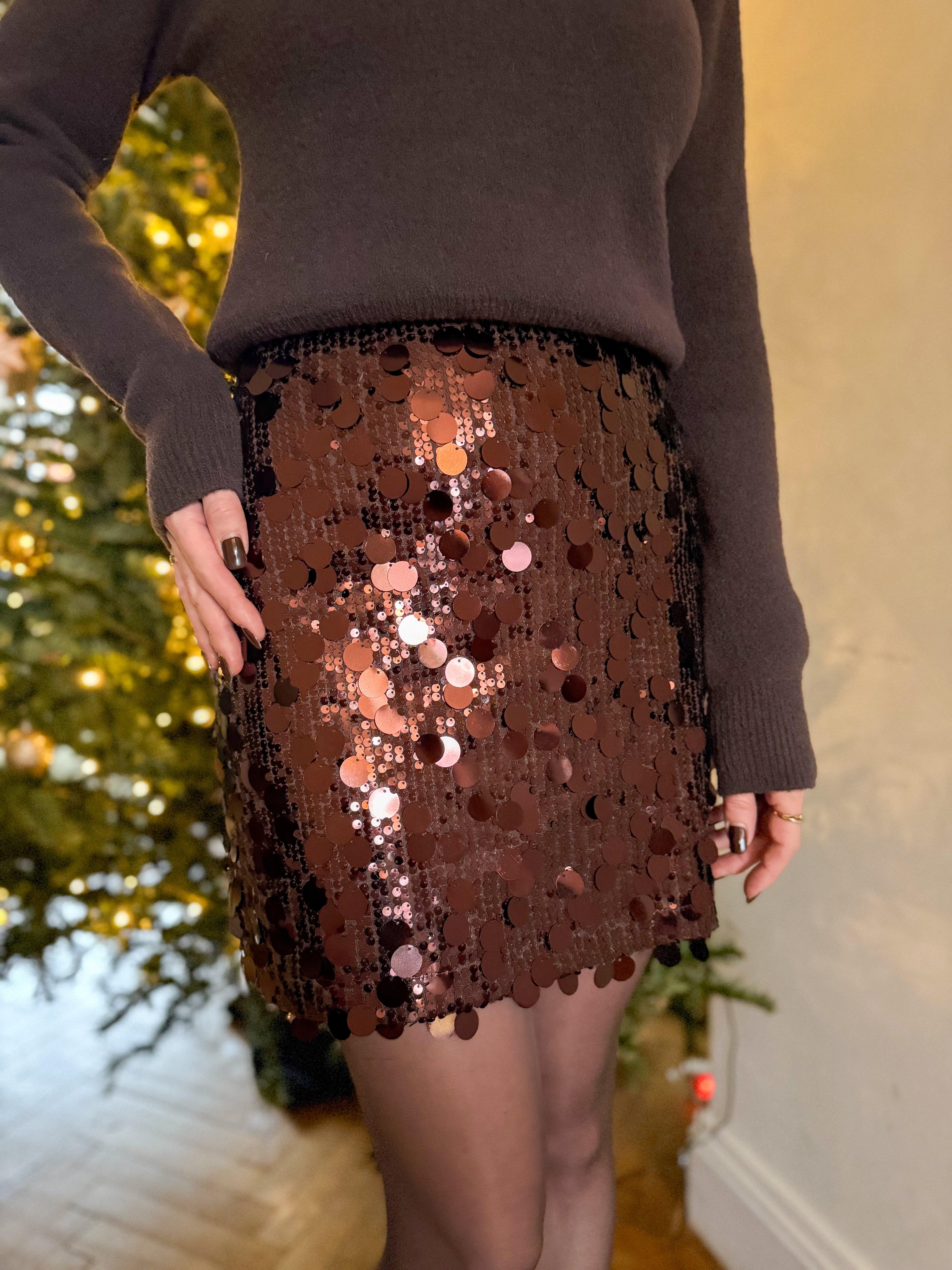 Avec notre jupe Johanna, impossible de passer inaperçue : ses sequins chocolat captent la lumière à chaque mouvement et créent un effet scintillant absolument somptueux.