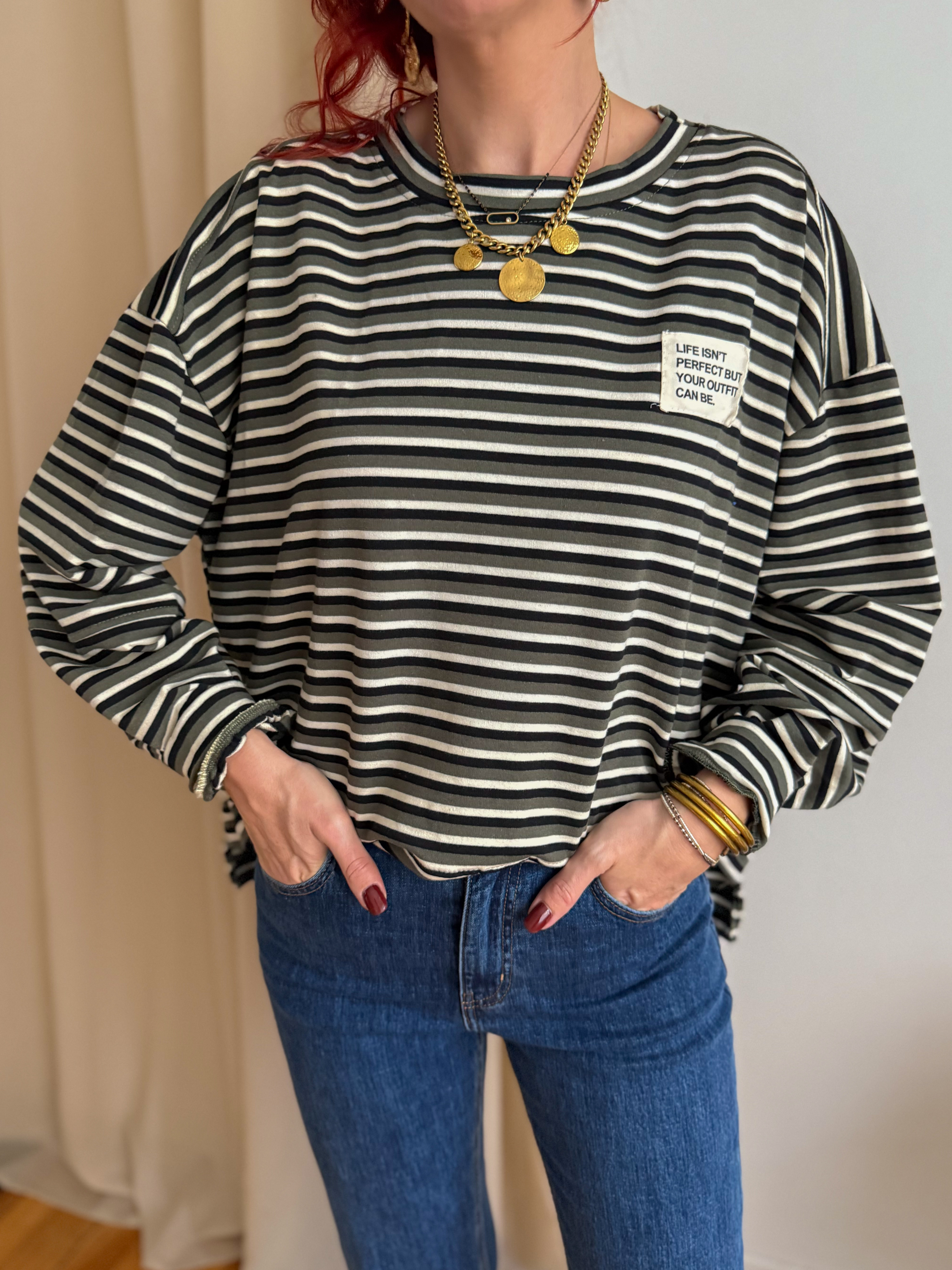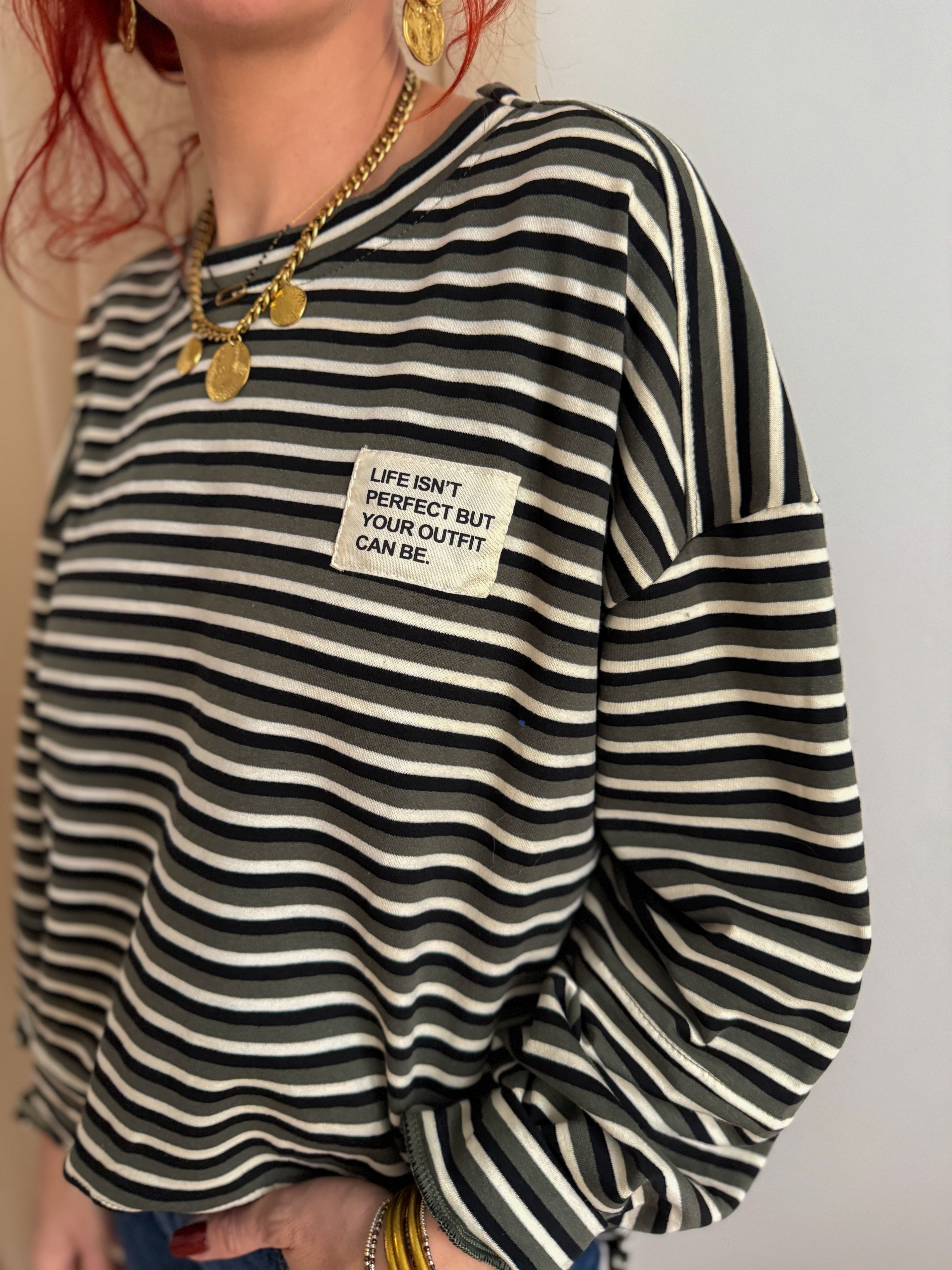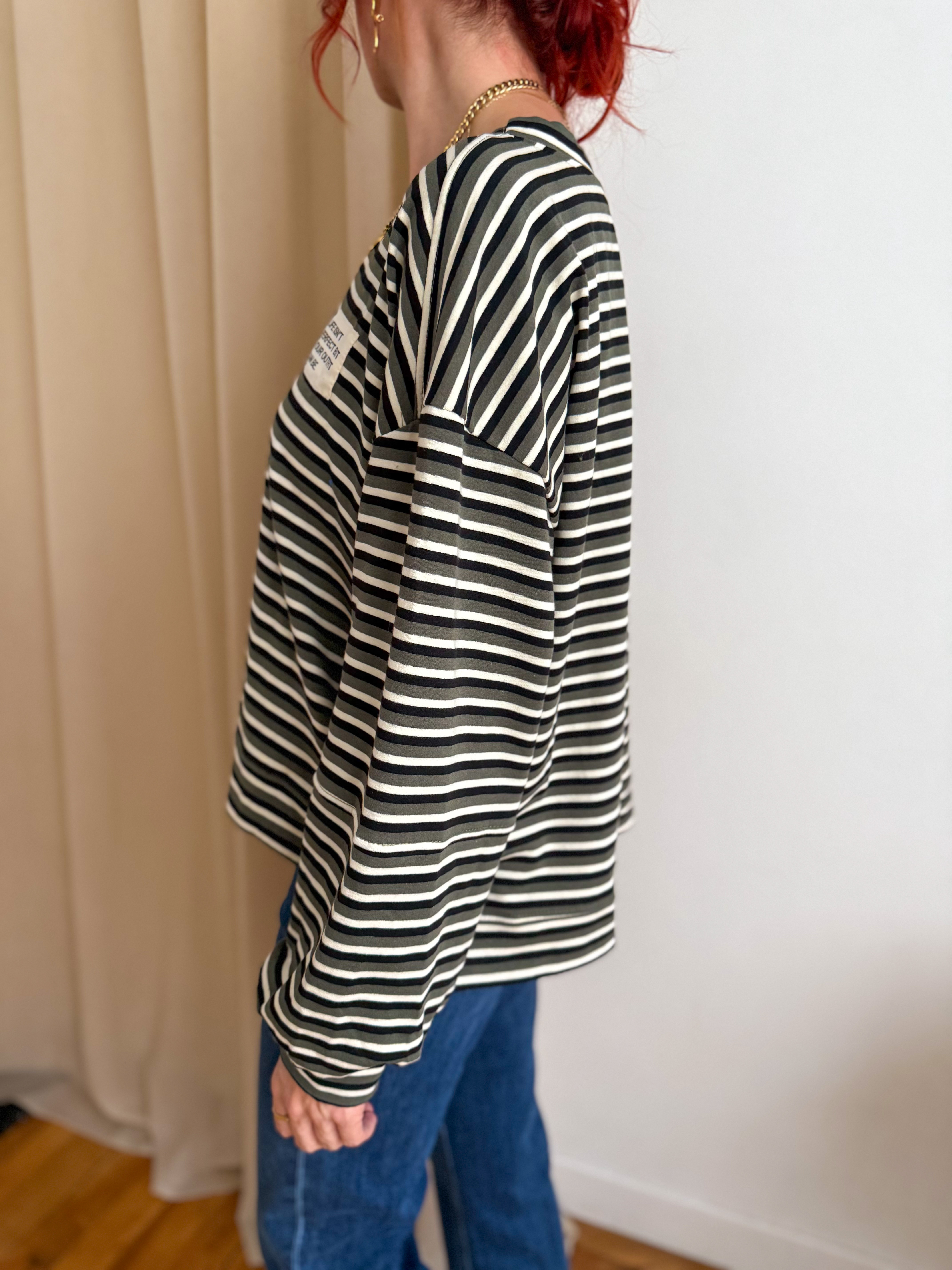 Notre pull Life revisite la rayure iconique dans une version ultra douce et moderne, avec une coupe loose et un petit message brodé sur la poche avant