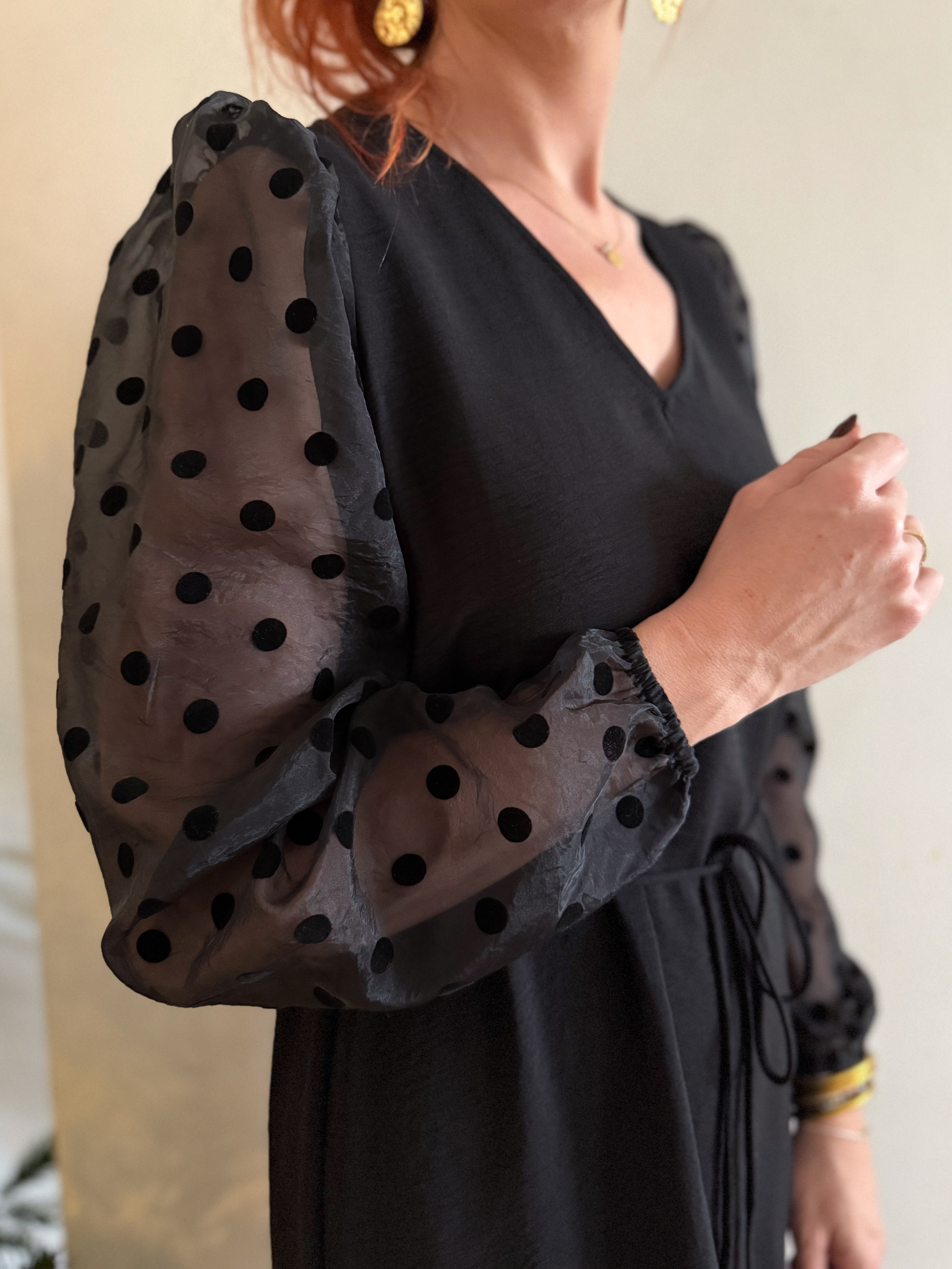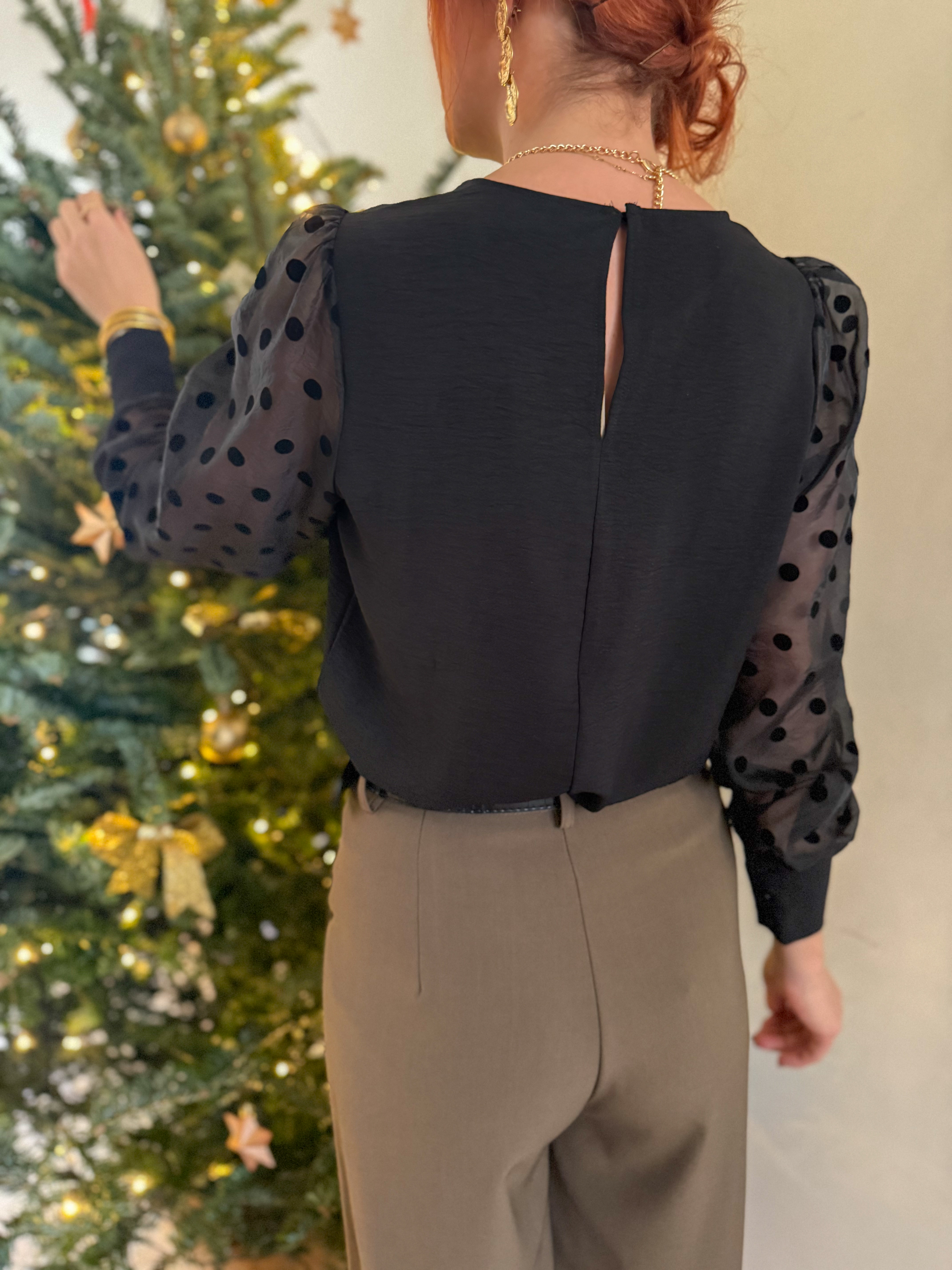 Son jeu de matières et ses manches tout en transparence apportent une touche glamour irrésistible, idéale pour les fêtes, les dîners ou toute occasion où l’on veut briller avec subtilité.