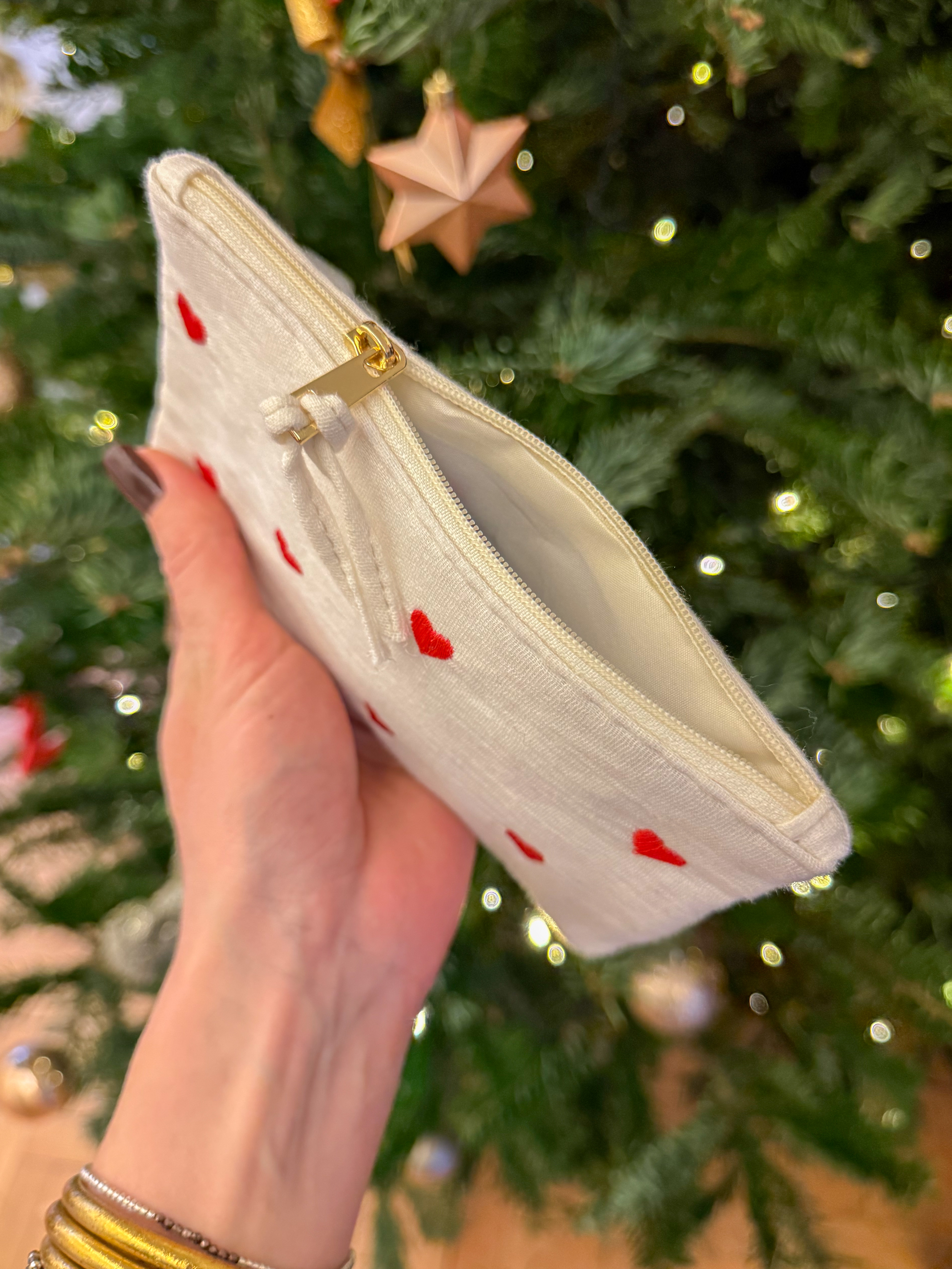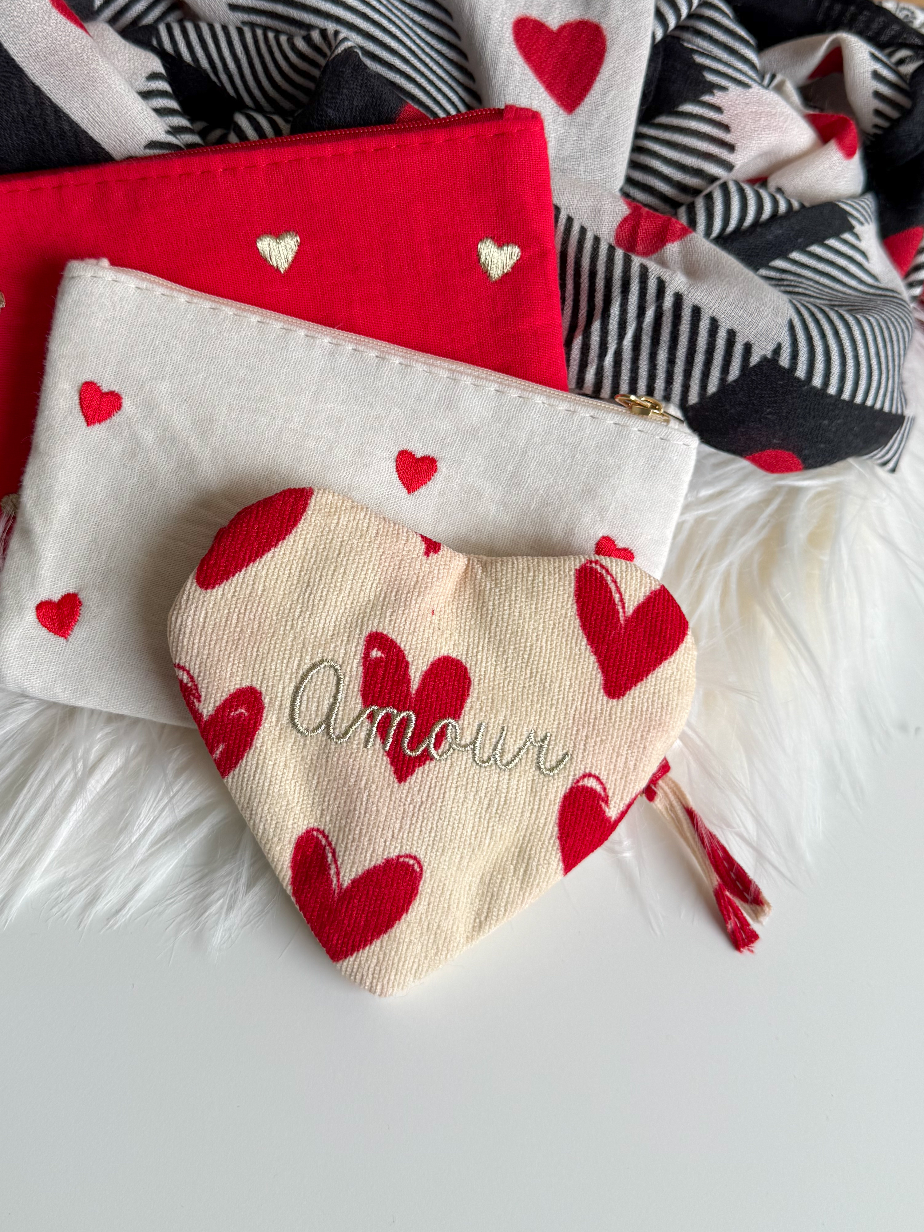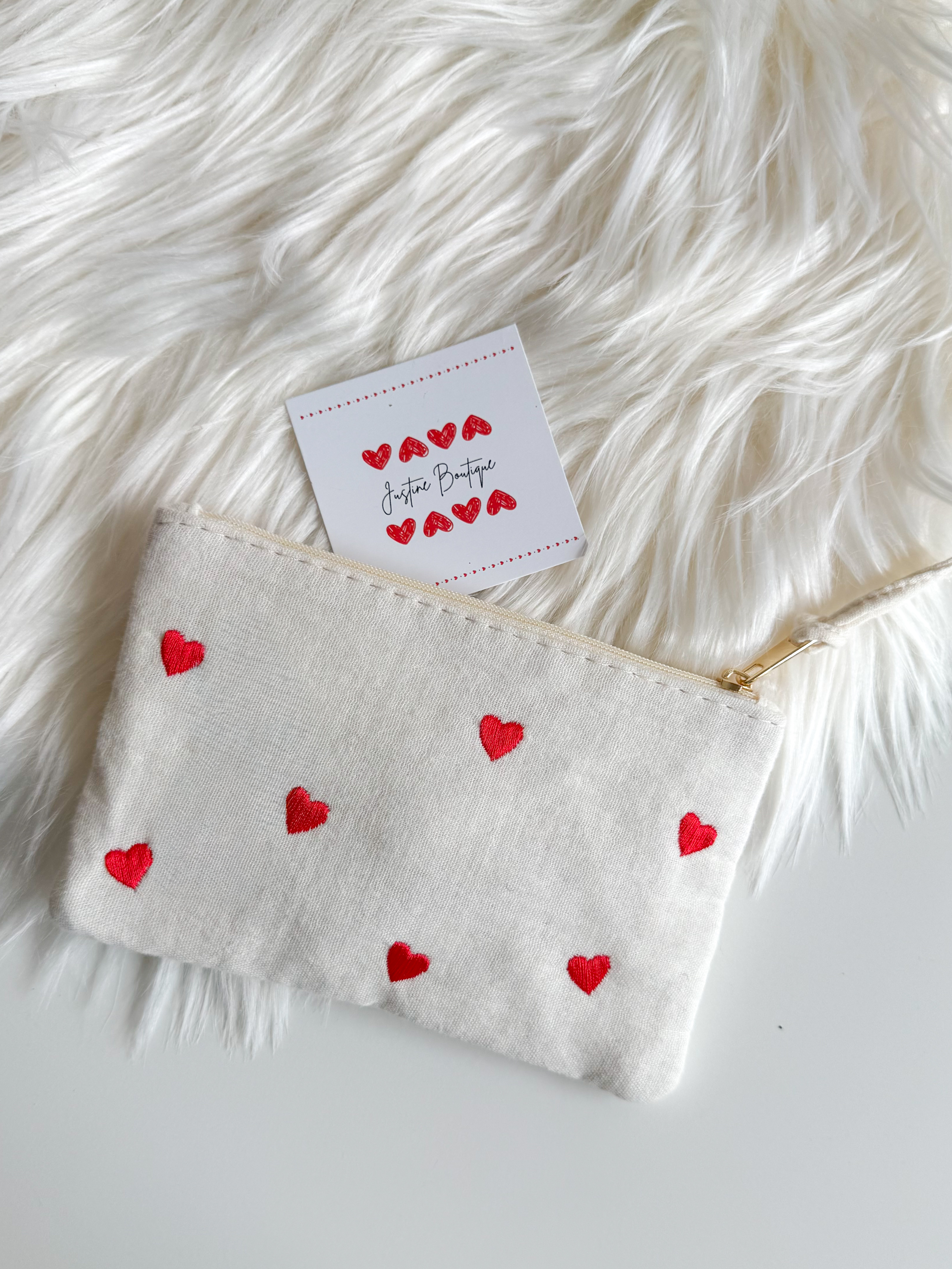 Ajoutez une touche de fun et d’élégance à votre quotidien avec cette jolie pochette en tissu blanche, ornée de petits cœurs rouges brodés