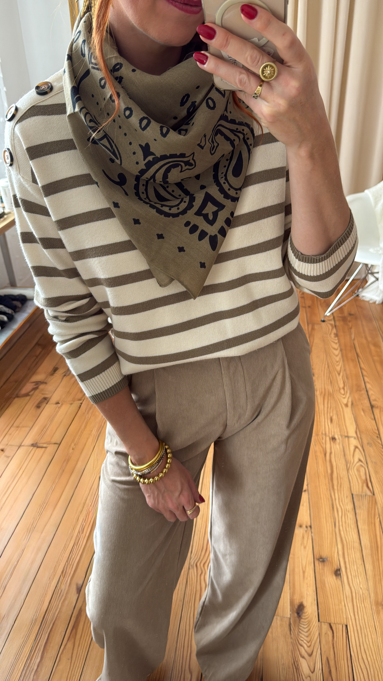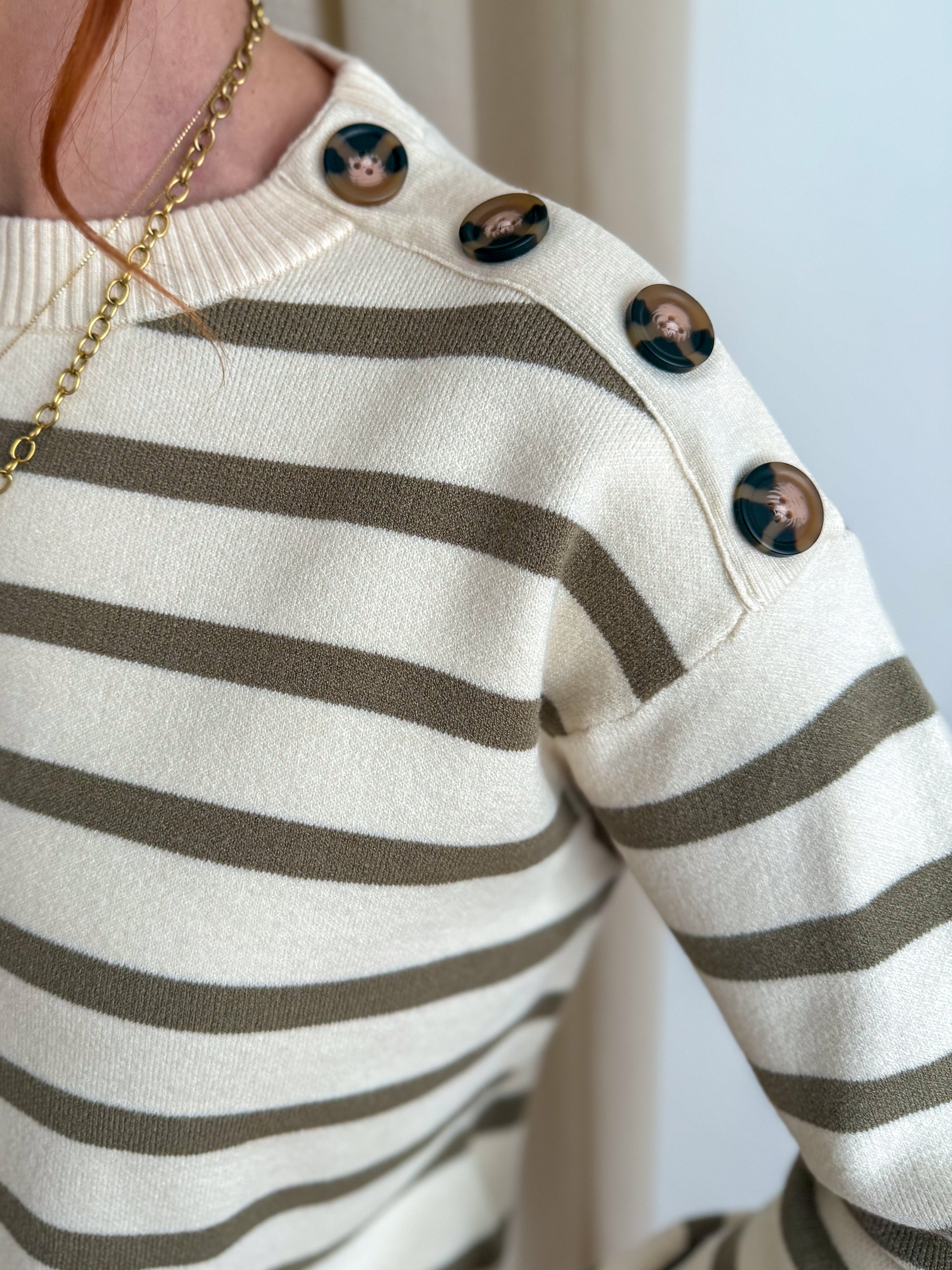Notre marinière Saba combine l’élégance de l’intemporel rayé et le détail mode qui fait la différence.