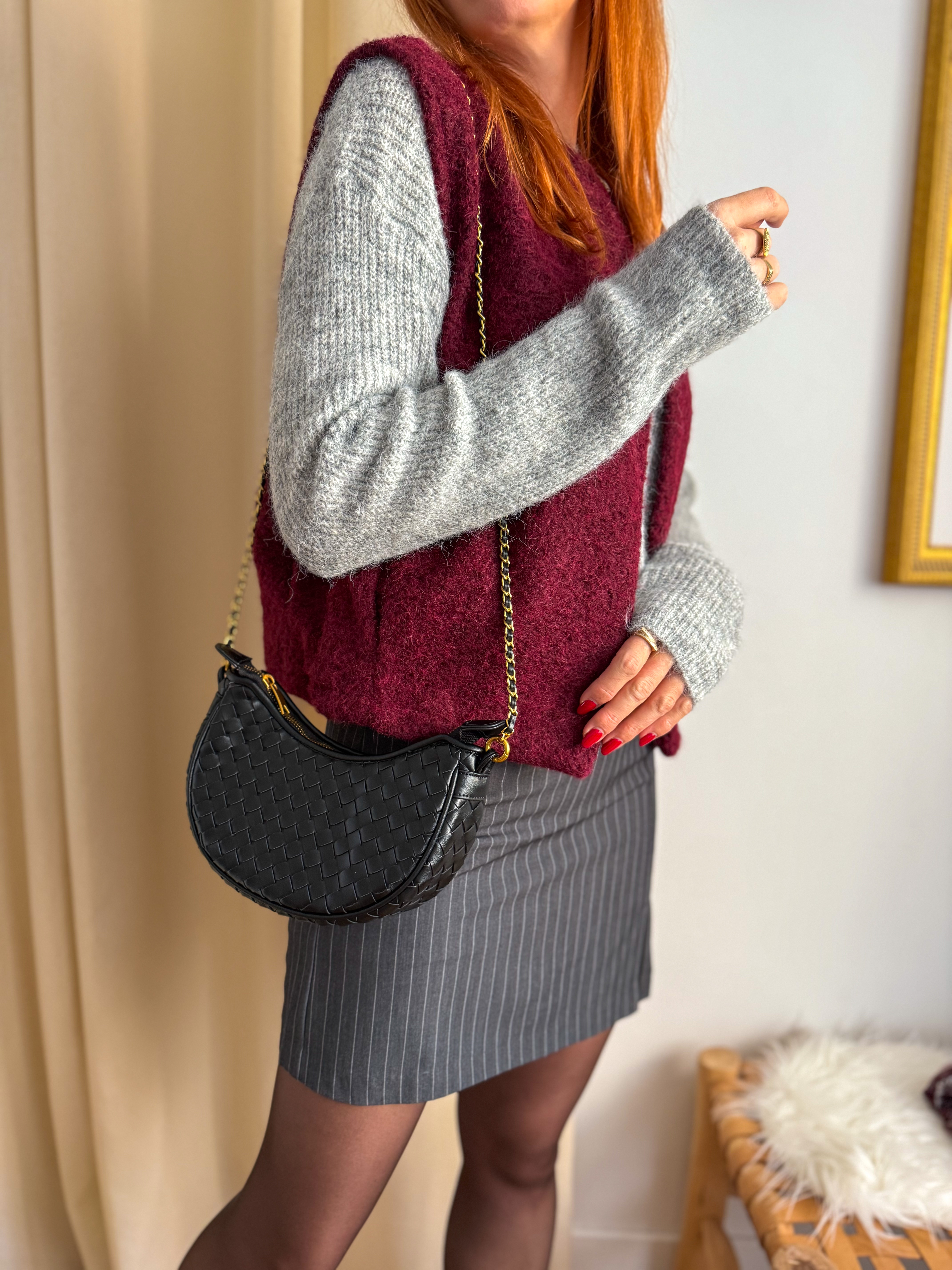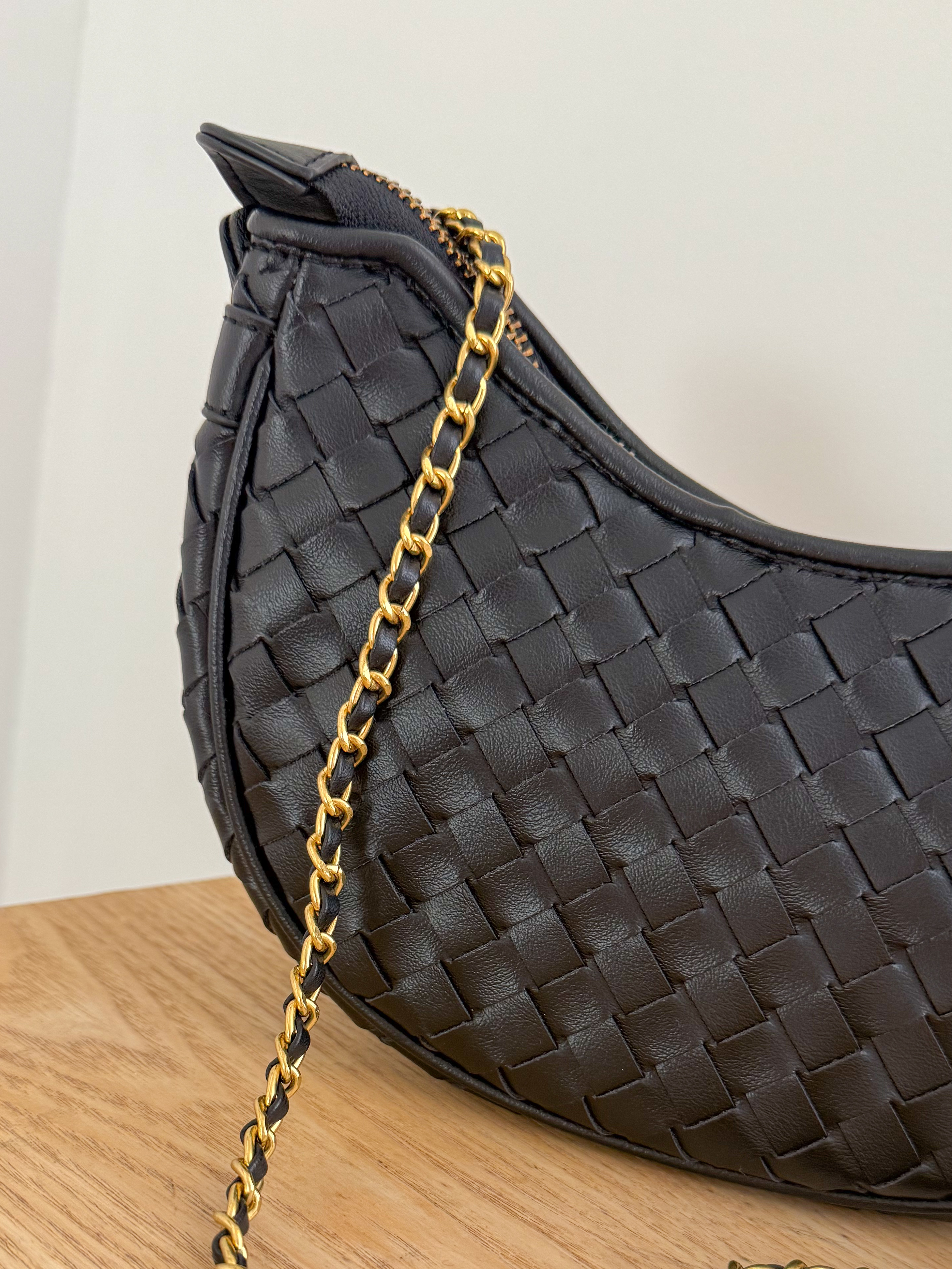 Notre sac tressé noir séduit par sa forme demi-lune moderne et son effet tressé raffiné, parfait pour un look à la fois tendance et intemporel.