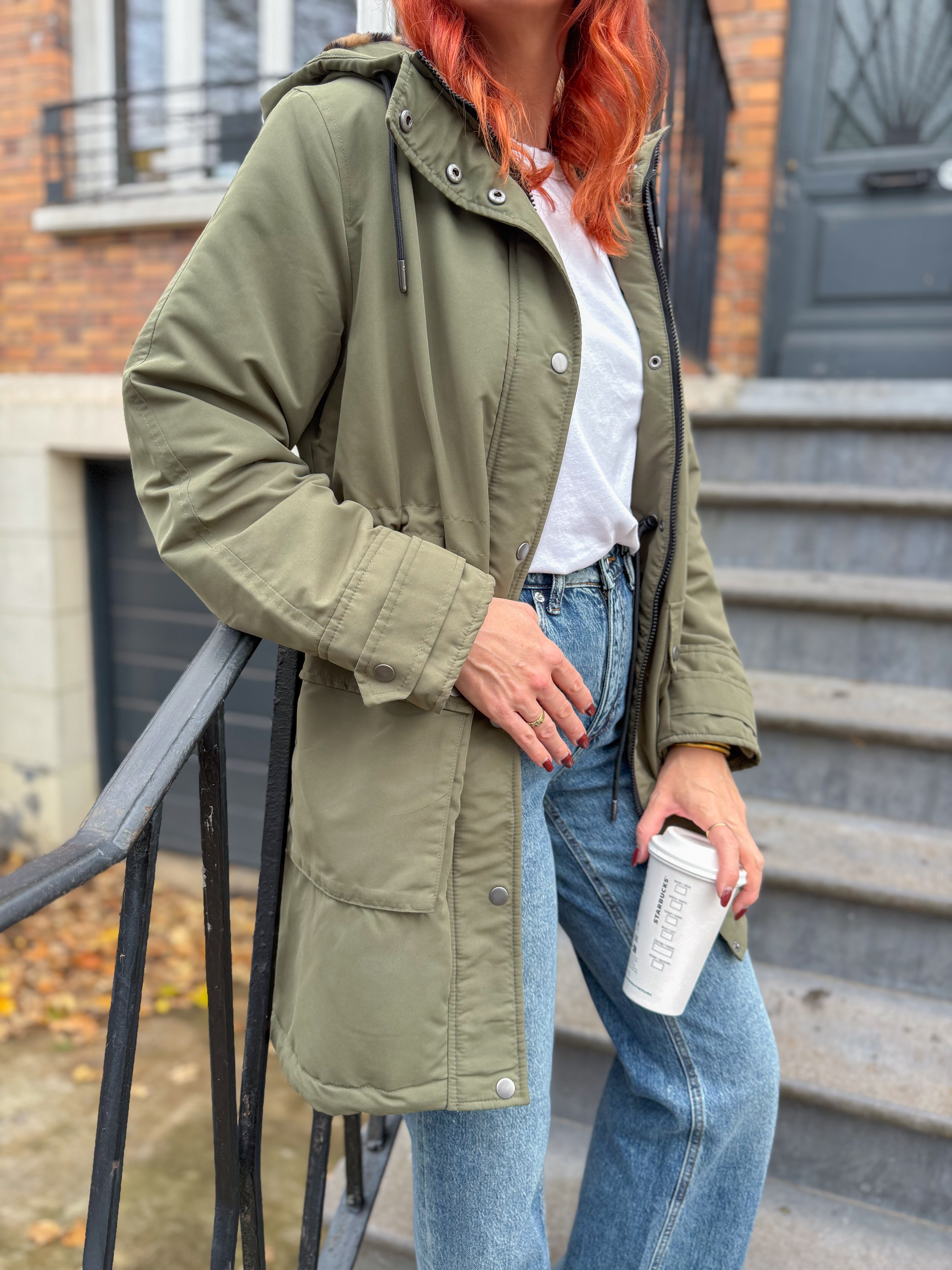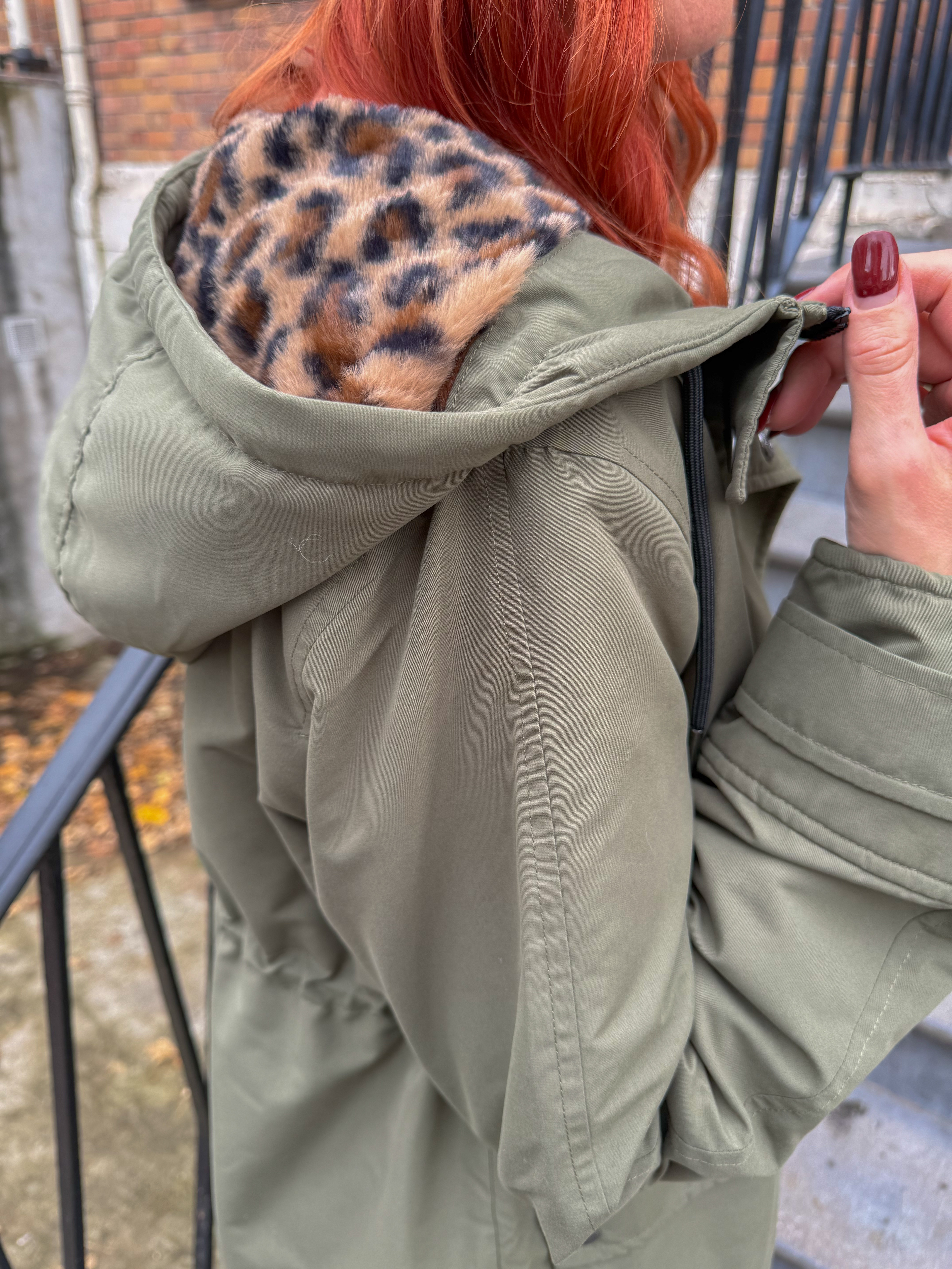 Avec sa coupe droite, sa capuche doublée en fausse fourrure motif léopard et ses grandes poches pratiques, c’est la pièce idéale pour affronter la saison avec style.