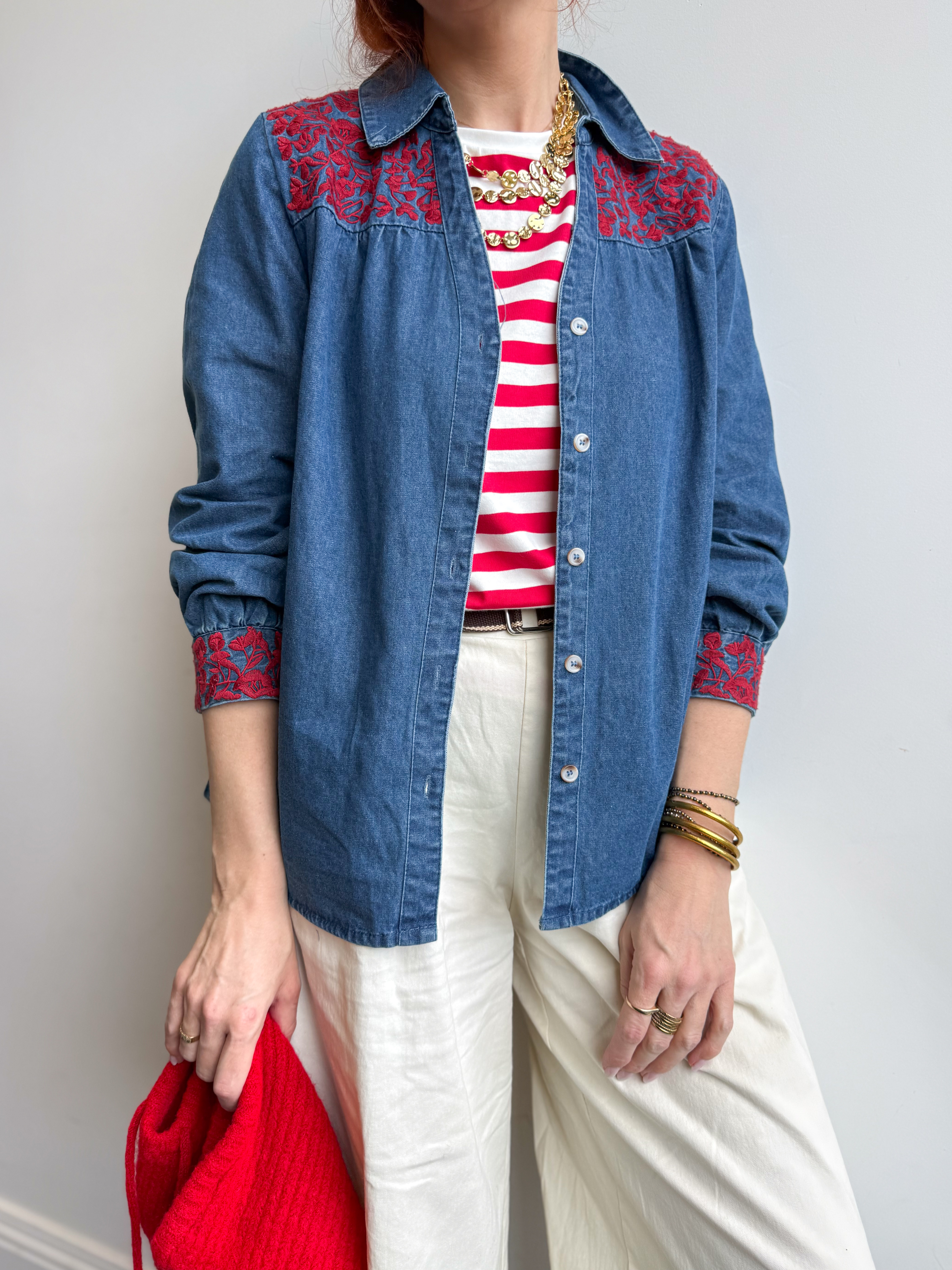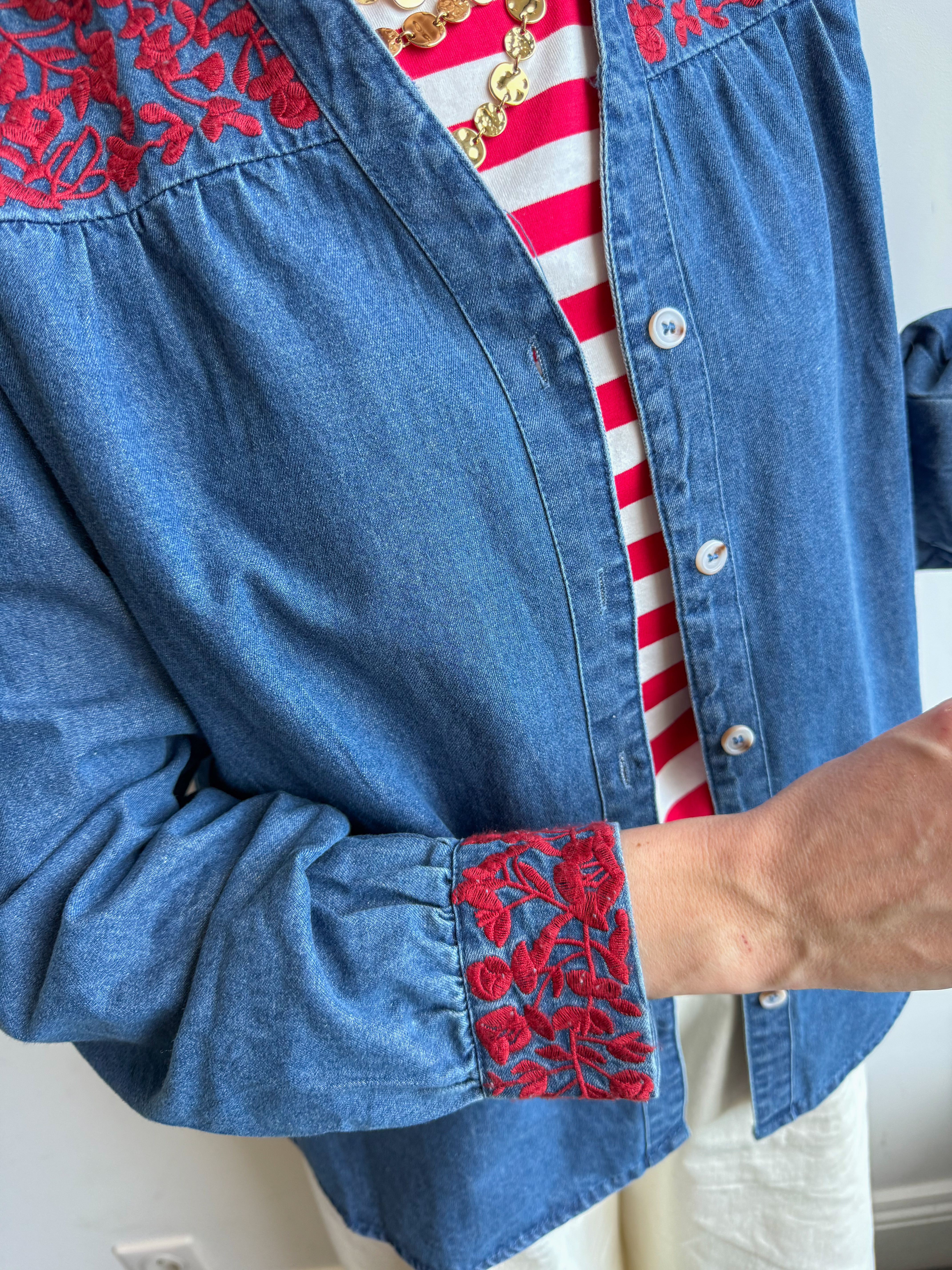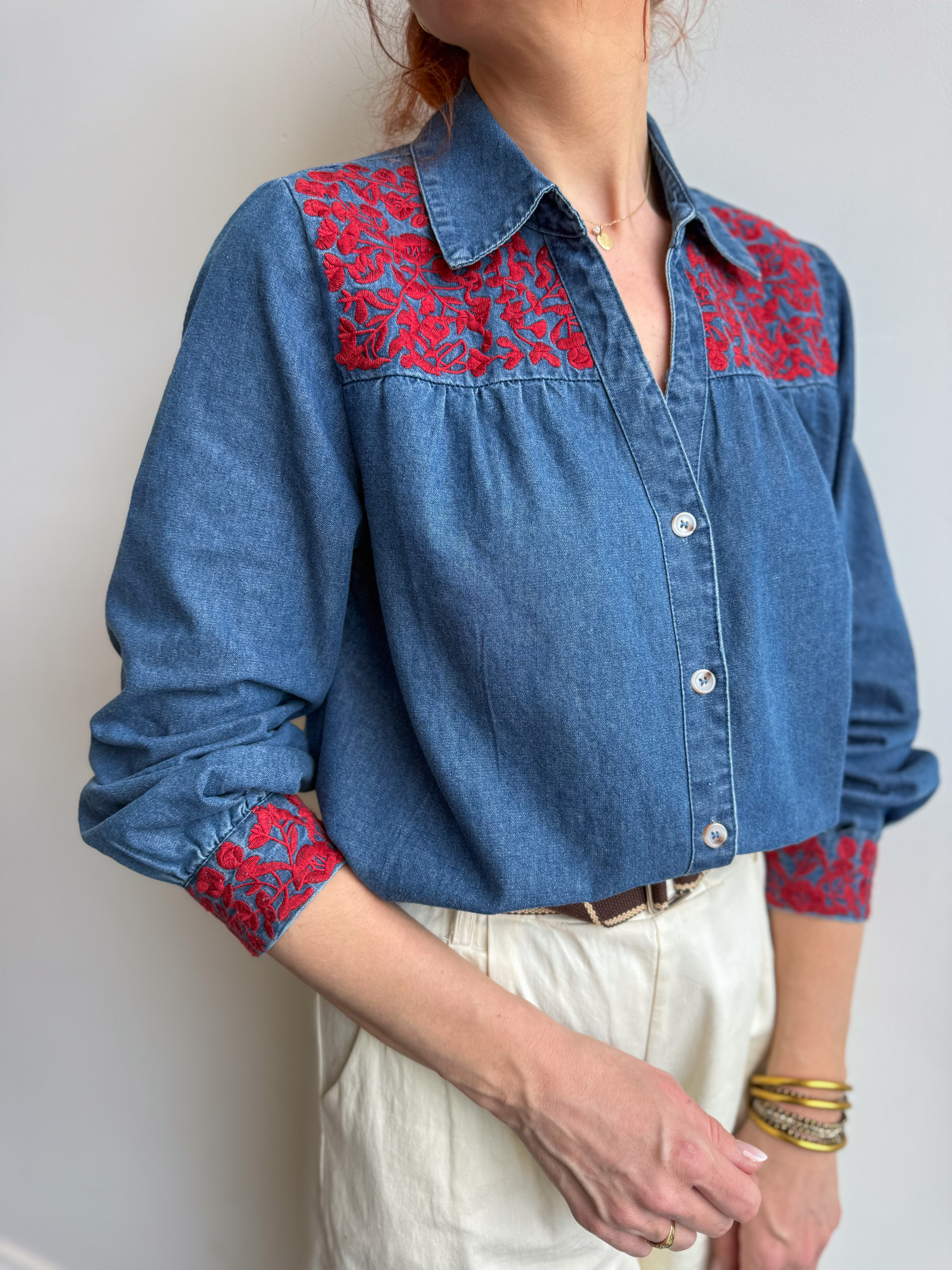 Notre chemise Scarlett en denim revisite un classique avec de jolis détails brodés qui font toute la différence.