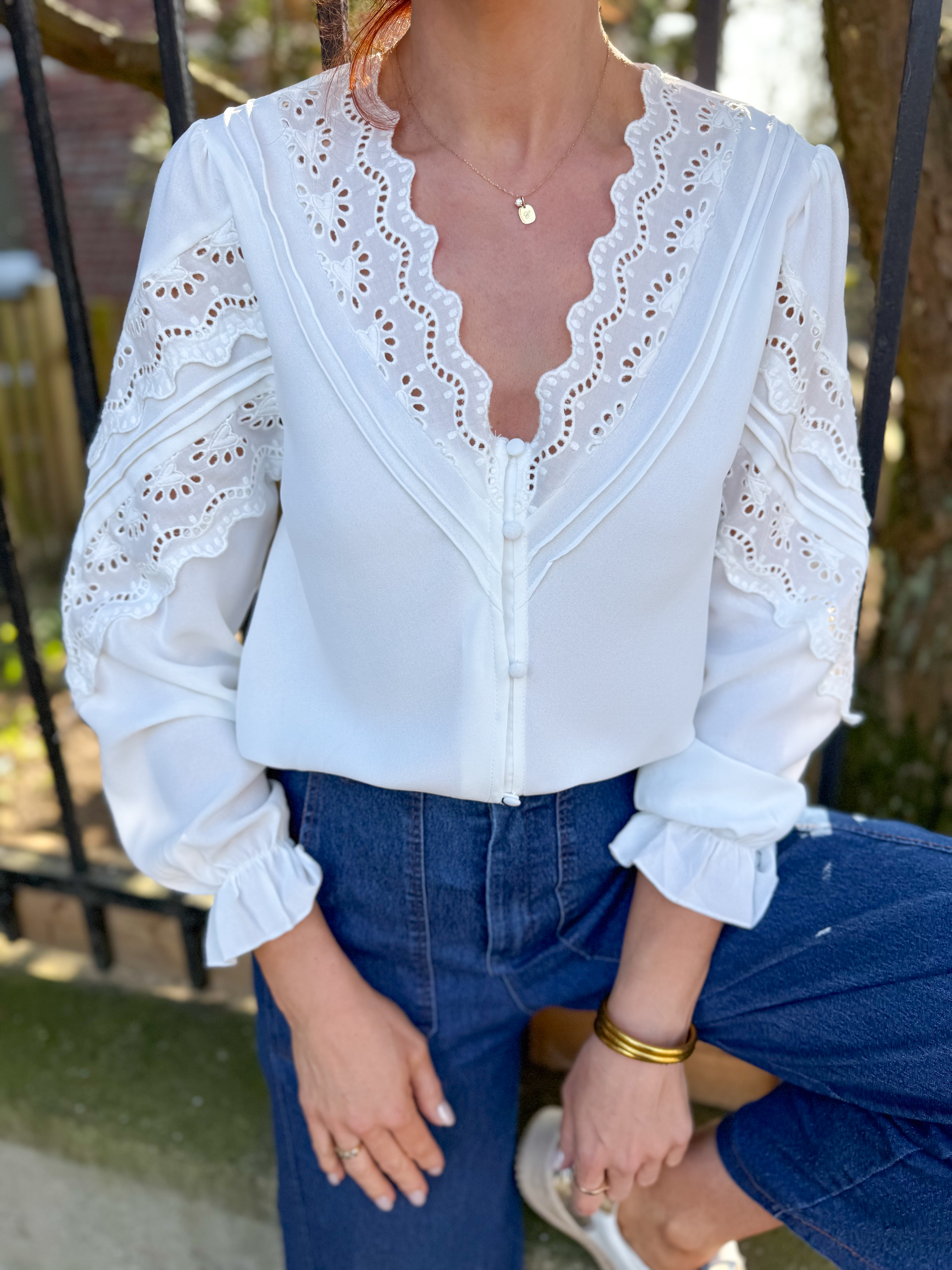 Joli décolleté en V festonné entièrement travaillé en broderie anglaise