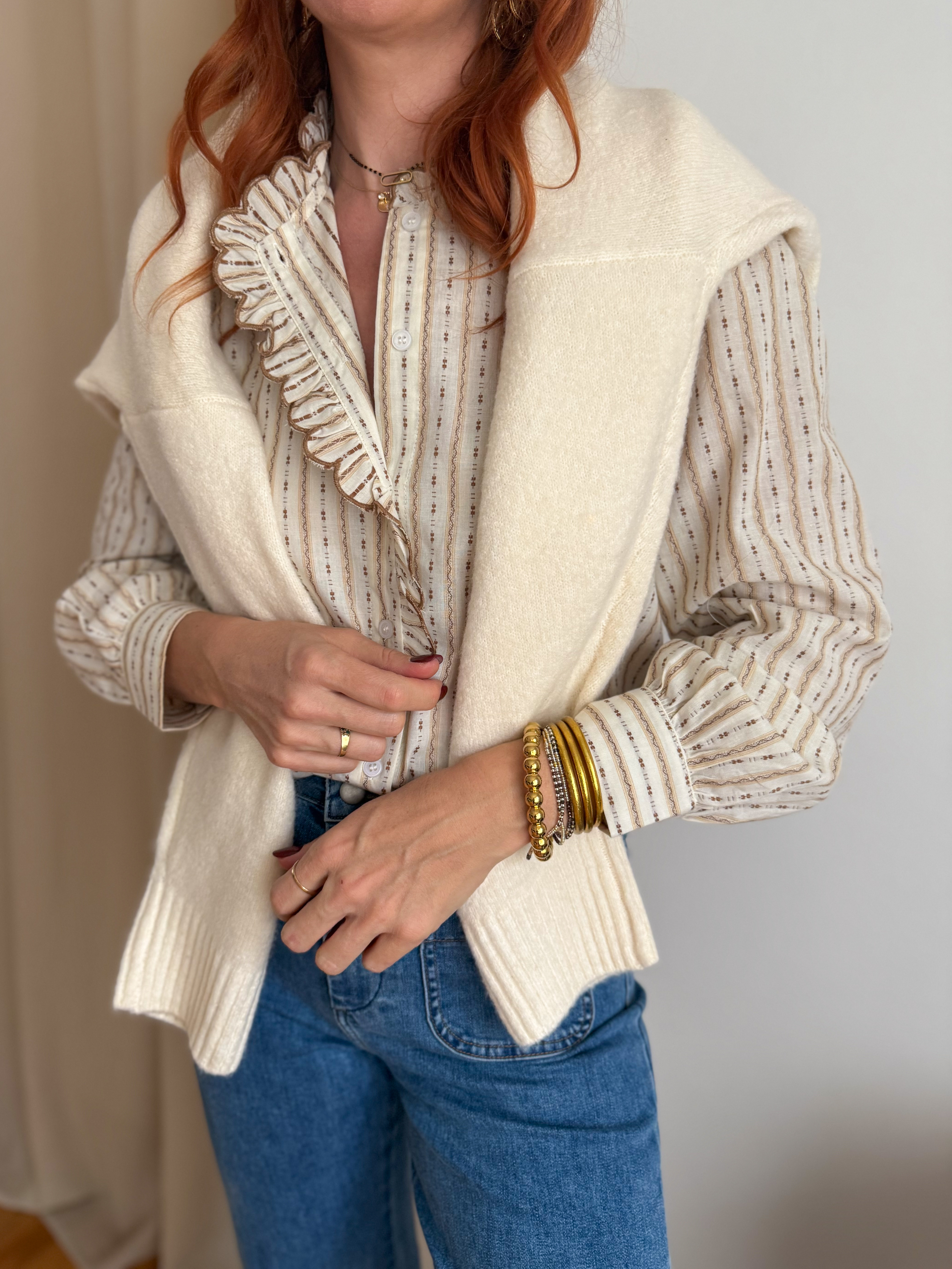 On craque pour son joli jeu de rayures fines et ses volants romantiques le long de la boutonnière, qui subliment le col et le décolleté.