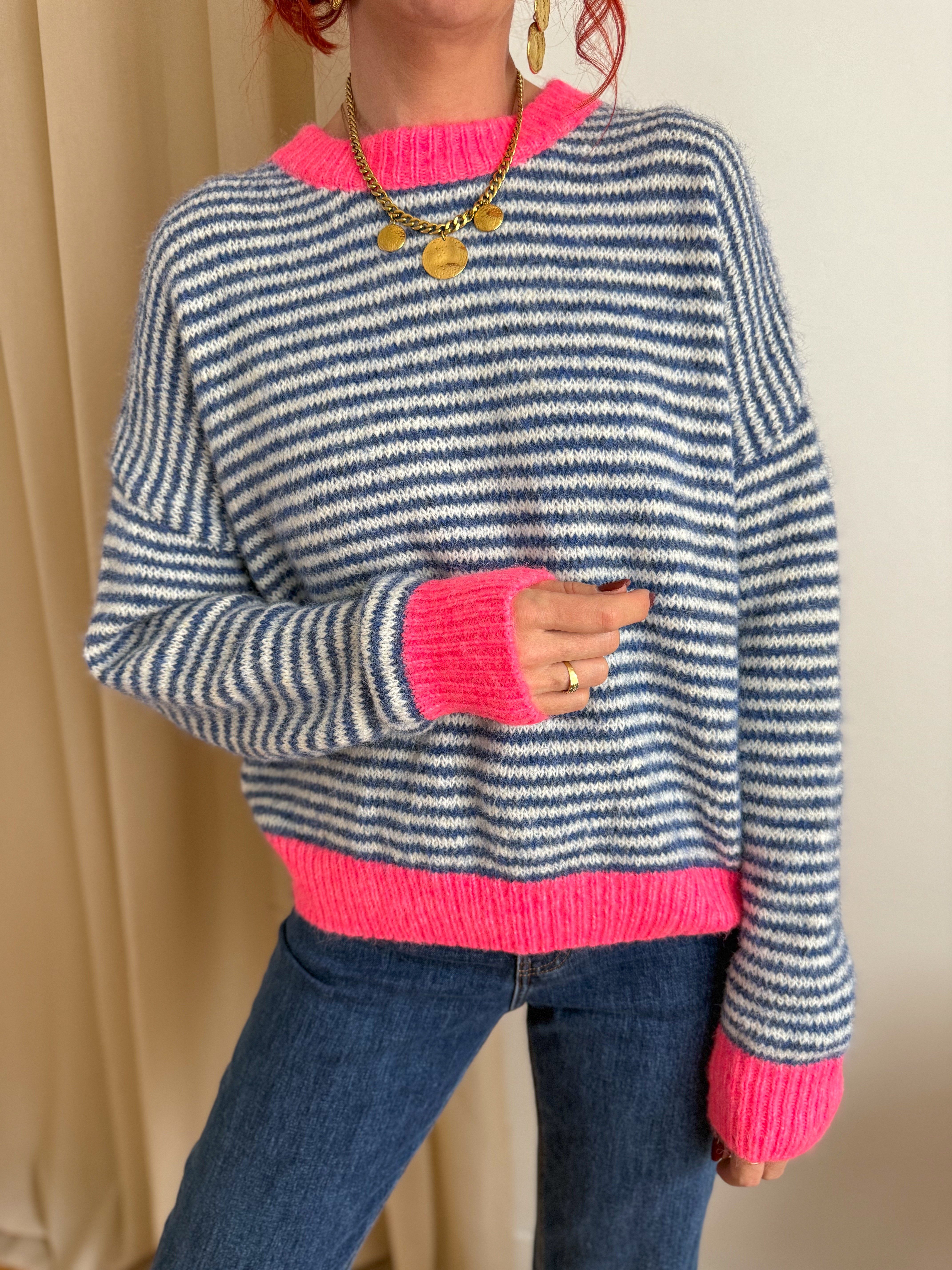 On craque pour son tricot moelleux, ses rayures bleu marine et écru et ses finitions rose fluo qui réveillent instantanément le look.