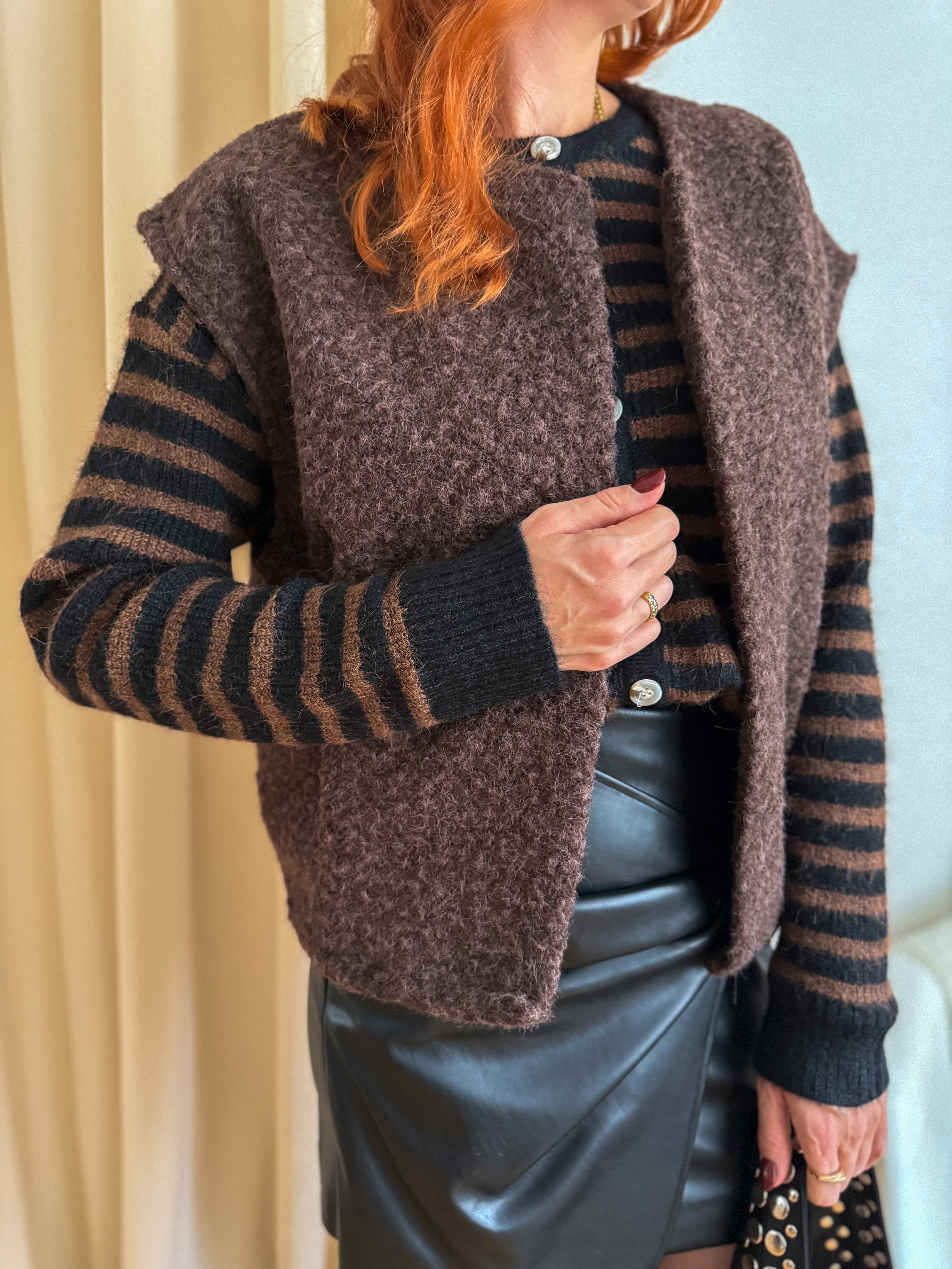 ✨ Notre veste Zac séduit par sa texture moelleuse et son coloris choco profond, idéal pour réchauffer vos tenues d’automne